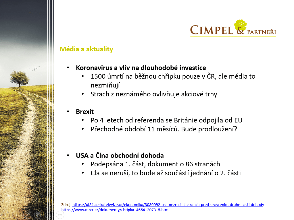 Jiří: Vybral jsem 3 věci, které byly v lednu aktuální a byly jich plné noviny. Bylo to téma coronaviru a jeho vlivu na dlouhodobé investice a na hospodářství a ekonomiku jako takovou. Měli jsme možnost sledovat to, že skutečně po 4 letech od referenda proběhl Brexit a Británie vystoupila z Evropské Unie a posledním tématem bylo to, že američané se dohodli s Čínou na první fázi obchodní dohody.