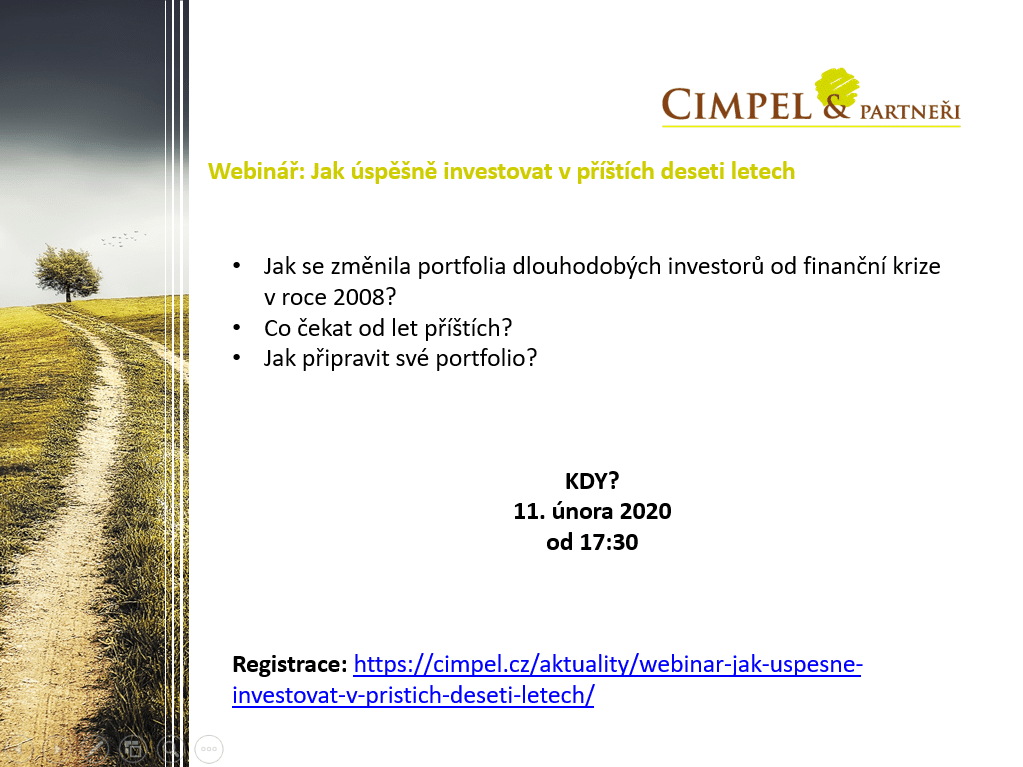 Poslední, co jsem sliboval, je pozvánka na náš webinář, který proběhne příští týden v úterý 11. 2. od 17:30 h. Bude na téma „Jak úspěšně investovat v dalších deseti letech“. Chceme se v něm podívat právě na to, jak se změnila portfolia investorů po velké krizi v roce 2008, co podle nás přinese další desetiletí a jak tomu přizpůsobit i Vaše investiční portfolio.