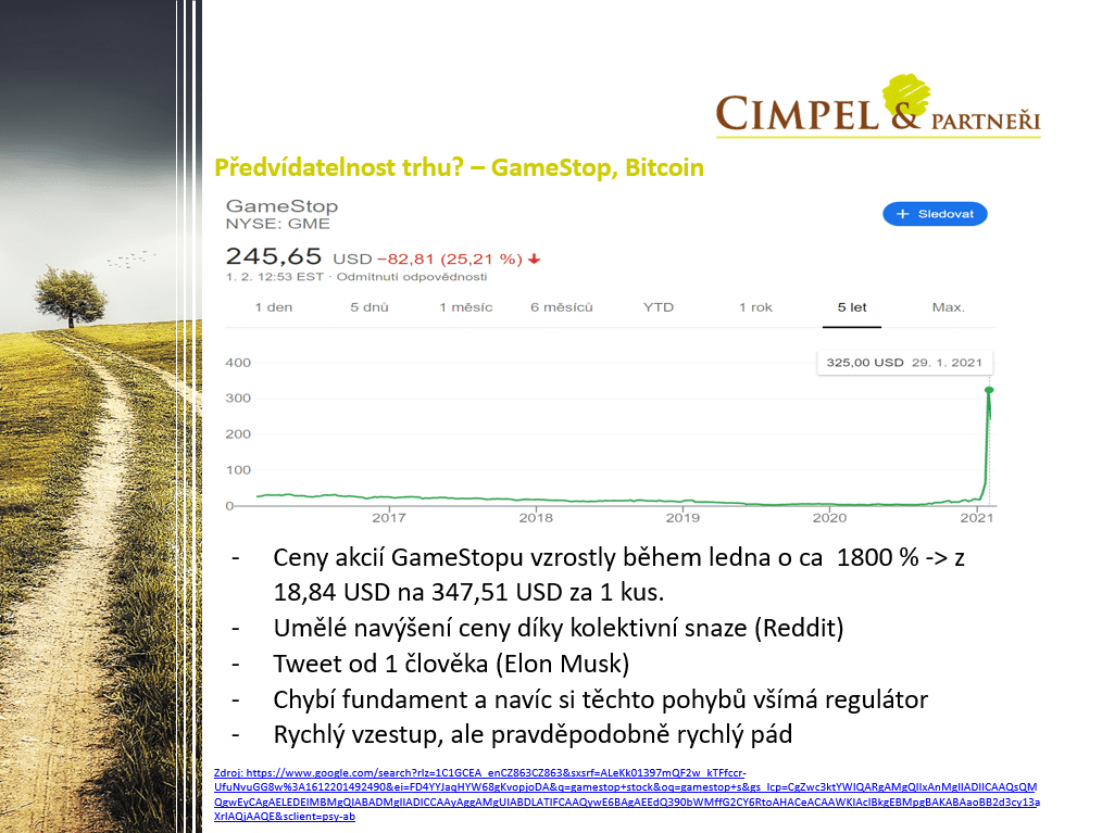 Dan: To je takový zajímavý výstřelek i na tom grafu. Když se podíváte, tak historicky se cena akcie pohybovala v řádech jednotek, maximálně desítek dolarů. A v lednu vystřelila na téměř 350 dolarů za kus. To je 1800 % zhodnocení. Ale je potřeba podívat se blíž, co za tím stojí. Ta kauza je zajímavá v tom, že cenu akcie vám může ovlivnit i kolektiv, který se na tom domluví. GameStop je toho konkrétním případem, protože se domluvil kolektiv lidí, retailových malých investorů, kteří si píšou na velkém finančním fóru, kde se schází x milionů lidí a píší si o Wall Streetu atp. Nasdíleli si informaci, že velké fondy spekulovaly na pokles ceny téhle akcie, takže úplný opak. A oni se domluvili, že tu akcii podpoří tím, že do ní hromadně nainvestují peníze. Tím pozvedli poptávku po akcii a proto zásadně vystřelila i cena. Takže to neleží až tak v tom fundamentu, protože ta společnost se potýkala se silnou konkurencí typu Amazon atp. a nebyla na tom až tak moc dobře. Nicméně tato poptávka jí vystřelila cenu akcie nahoru a takové vyšponování pak většinou končí i rychlým sestupem dolu.