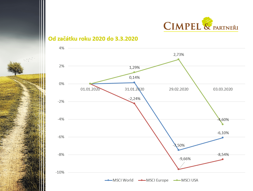 Co můžeme na finančních trzích od začátku roku vidět, je pokles. Za měsíc únor ztrácely trhy řádově 7 – 15 %. Nevidíme pokles v měsíci únoru na amerických akciích, ale to je dané tím, že my přepočítáváme kurzové pohyby a pokud jste sledovali trh, tak jste viděli, že dolar se stal bezpečným přístavem a výrazně posiloval a tím samozřejmě ztráty pro korunového investora z části eliminoval. Jinak ale pokles v rámci jednoho týdne byl velmi silný, byl jeden z nejsilnějších od roku 2008, kdy jsme zažívali finanční krizi. Tak jak byl ten pokles silný, tak relativně silně reagují trhy i v začátku měsíce března, kdy od pondělí vidíme na finančních trzích zklidnění a návrat indexů , nebo minimálně nabraly směr vzhůru k návratu do původních hodnot.
