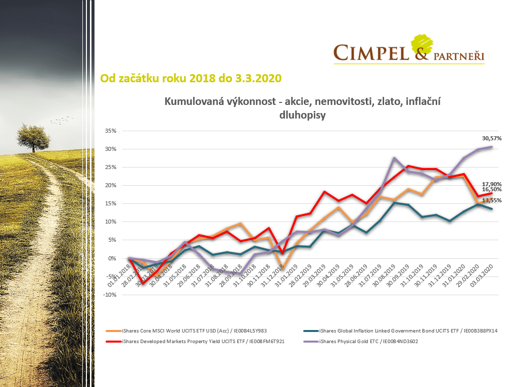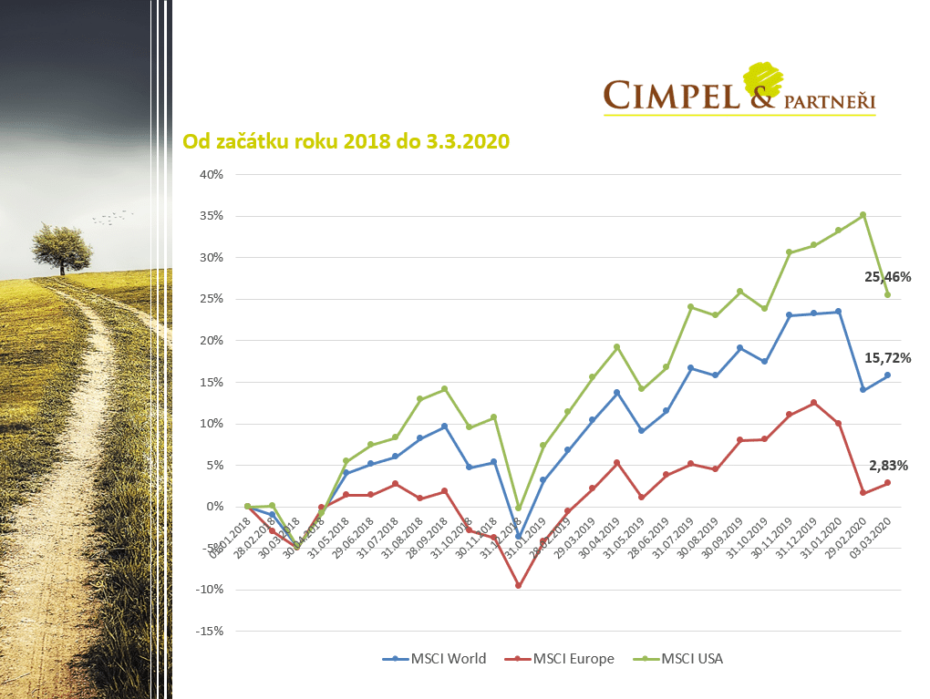 Dan: To je právě to, jak by se měl dívat dlouhodobý investor, protože z toho dlouhodobého pohledu – a teď se díváme od toho roku 2018 do 3. 3. 2020 – vidíme, že ten pokles nebyl až tak významný, jak se v tom krátkodobém měřítku může zdát. Čím delší horizont budeme sledovat, kdybychom tu křivku natáhli na 10 let, tak ho tam vlastně ani nepoznáme. Držme se toho, že jsme dlouhodobí investoři, pracujme s těmi trhy a dívejme se na to s odstupem a poklesy vnímejme jako příležitosti k nákupu aktiv ve slevě.