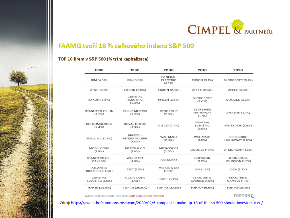 Jiří: Zde vidíte, jak se v jednotlivých letech mění ti největší hráči na finančních trzích. A jen řeknu, že v roce 1980 bylo 10 největších firem v čele s IBM a v roce 2020 mezi 10 největšími firmami není ani jedna z nich. Takže z našeho pohledu i sázka na jednotlivé akcie může být rizikem, může být komplikací. Myslíme si, že mnohem efektivnější je nákup celého indexu prostřednictvím nějakého pasivního nebo indexového fondu, kdy nemusíte řešit jestli zrovna IBM patří nebo nepatří mezi největší firmy, jestli jste dobře vybrali nebo ne. Pokud jste koupili v roce 1980 ETF fond nebo pasivní fond na index S&P 500, Váš výnos byl řádově 2 700 %, pokud jste si koupili IBM, vydělali jste taky, ale bylo to jen 700 %. Takže vidíte, že ten stock picking – výběr těch konkrétních akcií a hledání toho vítěze, se ne vždycky musí vyplatit a pokud nejste analytici, kteří by měli čas na to věnovat denně potřebné množství času ke sledování firem, jejich výročních zpráv a sledovat jejich průběžné cally nebo tiskové konference atd., je mnohem efektivnější a jednodušší nákup indexu a nesázet na jednu kartu.