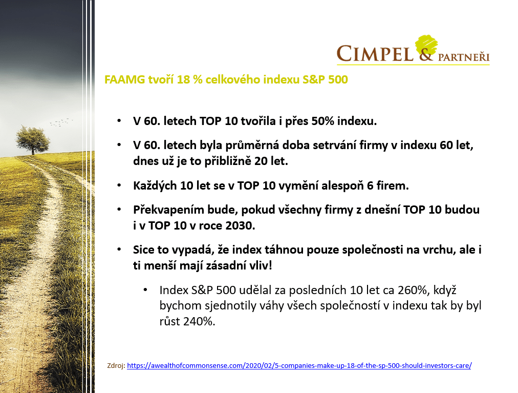 Dan: Když to shrneme, je velmi pravděpodobné, že když vyberete jednu firmu z TOP 10 z S&P 500 letos, že za 10 let tam nebude. Může a nemusí, ale ve většině případů jsme viděli, že tomu tak je a důležité je říci, že nevydělává pouze těch TOP 10 firem v tom indexu, ale vydělávají i ty ostatní. Takže když dáte všem těm firmám stejnou váhu, uvidíte, že rozdíl ve výkonnosti toho indexu nebude tak rapidní. Na indexu S&P to bylo například 240 % vůči 260 %, takže i ostatní firmy vydělávají – nebojme se kupovat celý index.
