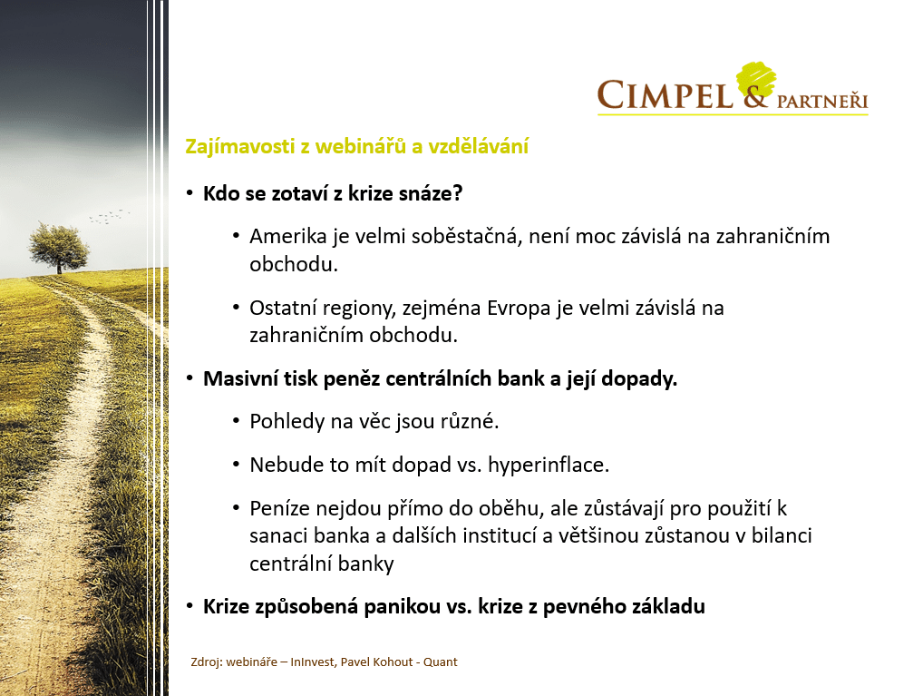 Je zajímavé podívat se i na to, co pravděpodobně způsobí ten masivní tisk peněz, který probíhá po celém světě ze strany centrálních bank. Pohledy na to jsou různé. Jsou vlastně 2 extrémní scénáře. Jeden, že se nestane nic a druhý, že ten extrém způsobí výraznou inflaci nebo dokonce hyperinflaci. My se spíš kloníme k té variantě, že nenastane žádný černý scénář. Ono skutečně kdyby centrální banky netiskly, tak bychom viděli mnohem tvrdší dopady, speciálně třeba na investory a na finanční trhy z pohledu té současné situace. Takže nedokážeme říci, co se stane, když tisknou, ale určitě dokážeme říct, co by se stalo, kdyby netiskly. Tam bychom dneska viděli mnohem hlubší a mnohem intenzivnější krizi než zažíváme a i ten návrat by trval rozhodně mnohem déle. Dá se říci, že můžeme být rádi, za to, že centrální banky reagovaly rychle a doufejme, že i včas. Co se týká té současné krize, tak můžeme říci, že oproti té krizi z roku 2008 je trošku jiná v tom důvodu, který je za ní. Ten důvod není technický, jak jsme to viděli v roce 2008, ale je skutečně daný tou labutí, která nám na ten trh přiletěla v podobě epidemie, která nám pozastavila ekonomiku na nějakou dobu a dá se očekávat, že i ten návrat bude rychlejší, než když ty problémy jsou strukturální.