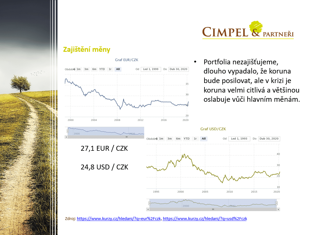 Jiří: Tento obrázek na měny, se mi zdá zajímavý, protože v dobách, kdy koruna posilovala a ještě před rokem to vypadalo, že není jiná varianta, než že bude jenom posilovat, tak to měnové nezajištění vypadalo jako určité riziko v portfoliu a občas se nás kolegové poradci ptali, proč nezajišťujeme atd. My se držíme té strategie právě proto, že investujeme na dlouhé horizonty, chceme kupovat ta globální aktiva a cena za to zajištění se nám zdá v tom dlouhodobém měřítku zbytečná. Teď se ukázalo, že právě v krizi utíkají investoři od aktiv jako jsou česká koruna do bezpečných přístavů jako je dolar a viděli jsme vlastně , že koruna vůči těm globálním měnám významně oslabila v relativně krátkém čase, což samozřejmě pro naše investory znamenalo pozitivní bod pro zmenšení těch poklesů, které probíhaly.