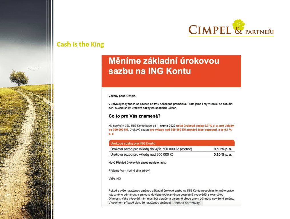 Stejně tak mě nedávno překvapila zpráva od mojí banky, kde mám ING konto a psali mi, že úrokovou sazbu snížili na 0,3%. Samozřejmě platí to, že spořící účty nejsou produktem, na kterém byste měli držet svou dlouhodobou hotovost nebo svá dlouhodobá aktiva. Pokud si nevíte rady, jak s investicemi bezpečně a smysluplně naložit, ozvěte se nám, rádi Vám pomůžeme.