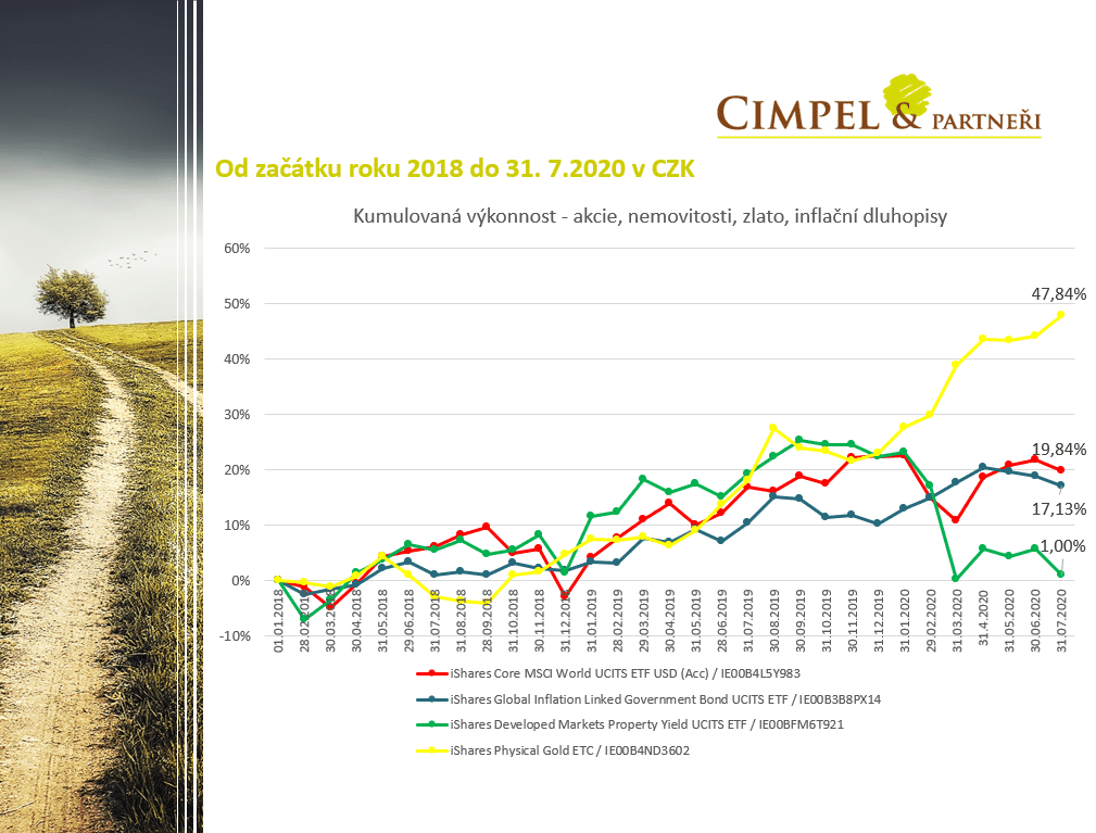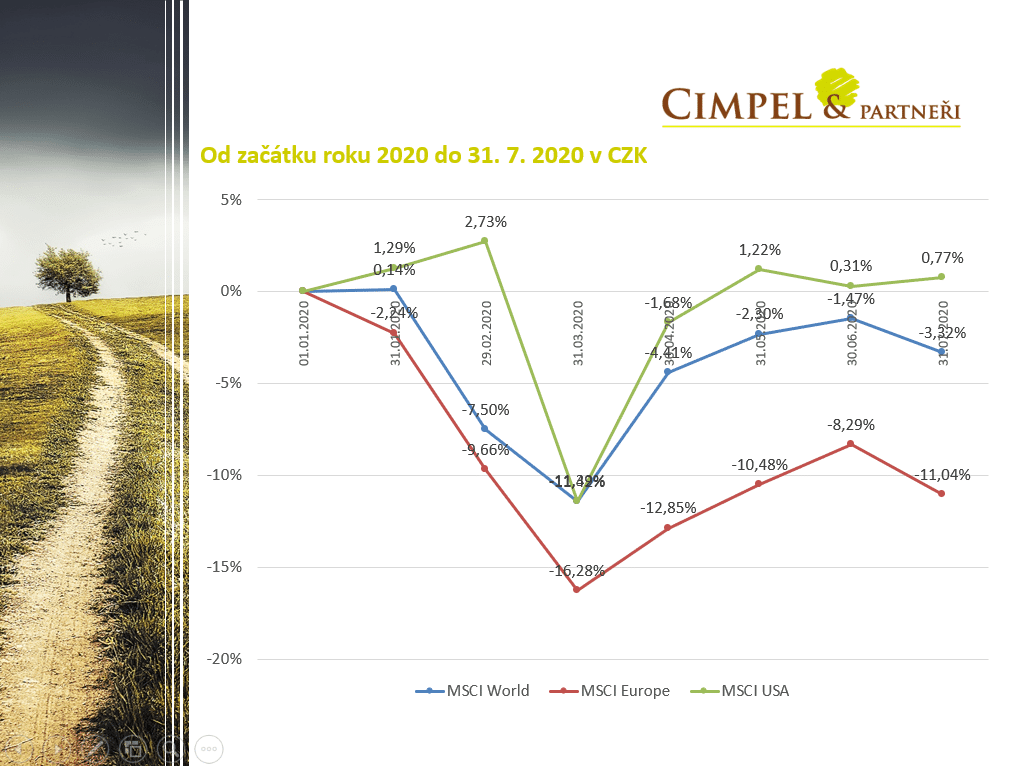 Jiří: Začneme rovnou prvním obrázkem, který ukazuje, jak se vyvíjely finanční trhy, respektive akciové trhy, od začátku letošního roku. Můžeme vidět, že jsme na amerických akciích mírně nad hodnotou, která byla na počátku roku. Globální akcie, které jsou namíchané z evropských aktiv, pořád mírně zaostávají a Evropa, bohužel, dohání ten svět jako takový, takže tam jsme pořád ještě na hodnotě mínus 10 %. Co bych Vám na tomto obrázku označil jako zajímavost, je to, že pokles, který jsme viděli na akciových trzích pro českého investora, který investuje své peníze, vkládá je v korunách a nezajišťuje, tzn. že drží aktiva v měnách jako je dolar nebo euro, vlastně ten letošní pokles nebyl tak velký, jako byl třeba pro investora amerického, pro kterého je domovskou měnou dolar. Důvodem bylo, že pokles na finančních trzích a na akciích, který jsme viděli ve dnech v průběhu března/dubna, byl kolem mínus 30 – 35 %, ale v přepočtu do koruny byl ten pokles jen kolem 10 %. Příčinou bylo významné oslabení koruny, respektive posílení dolaru i eura. Dolar se začátkem roku obchodoval kolem 22 korun za dolar a v těch největších výkyvech na trhu jsme viděli dolar i kolem 25 korun za 1 dolar. To bylo něco, co při posílení dolaru o víc než 10 %, pomáhalo významně korigovat pokles hodnoty portfolia pro korunového investora a to samozřejmě pomáhalo i držet českému investorovi nervy na uzdě.