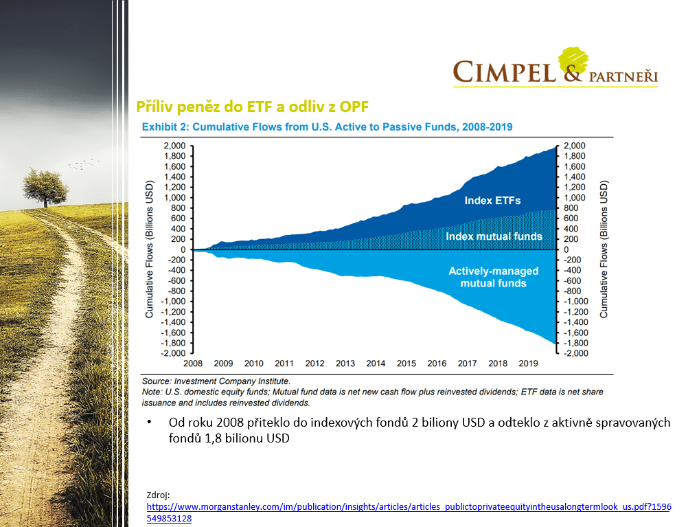 Jiří: My jsme vybrali ještě dva takové zajímavé články, které vyšly v posledním měsíci. První je analýza od Morgan Stanley, která ukazuje, že od roku 2008 „přiteklo“ do pasivně spravovaných fondů 1,8 bilionů dolarů, to znamená 1 800 miliard dolarů a z aktivně spravovaných fondů naopak „odteklo“ přes 2 biliony, tj. přes 2 000 miliard dolarů. Ukazuje to, že směr k pasivnímu investování je celkem nezastavitelný a aktivní správci tím samozřejmě trpí. Nejčastějším důvodem tohoto přesunu je podvýkonnost aktivních fondů a samozřejmě i trošku změna fundamentu na trhu, kdy investoři dnes mají mnohem snazší přístup právě k různým robo platformám a systémům, skrze které mohou jednoduše on-line nakupovat cenné papíry a mohou přímo nakupovat akcie pasivních fondů a není důvod, aby je nakupovali přes správce aktivní.