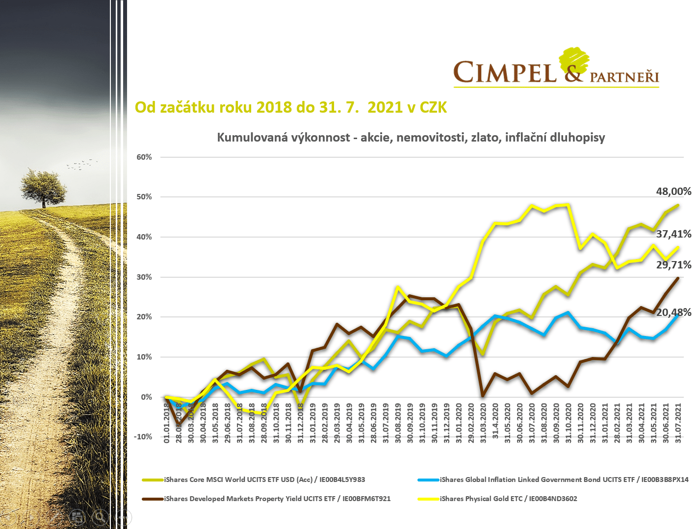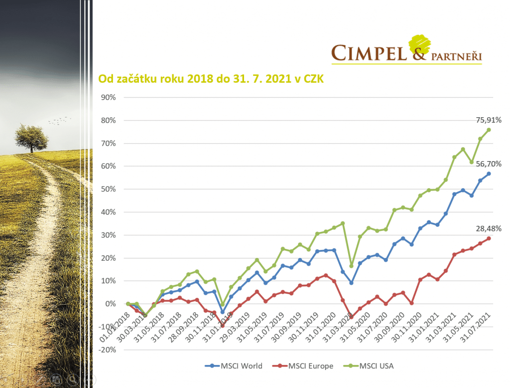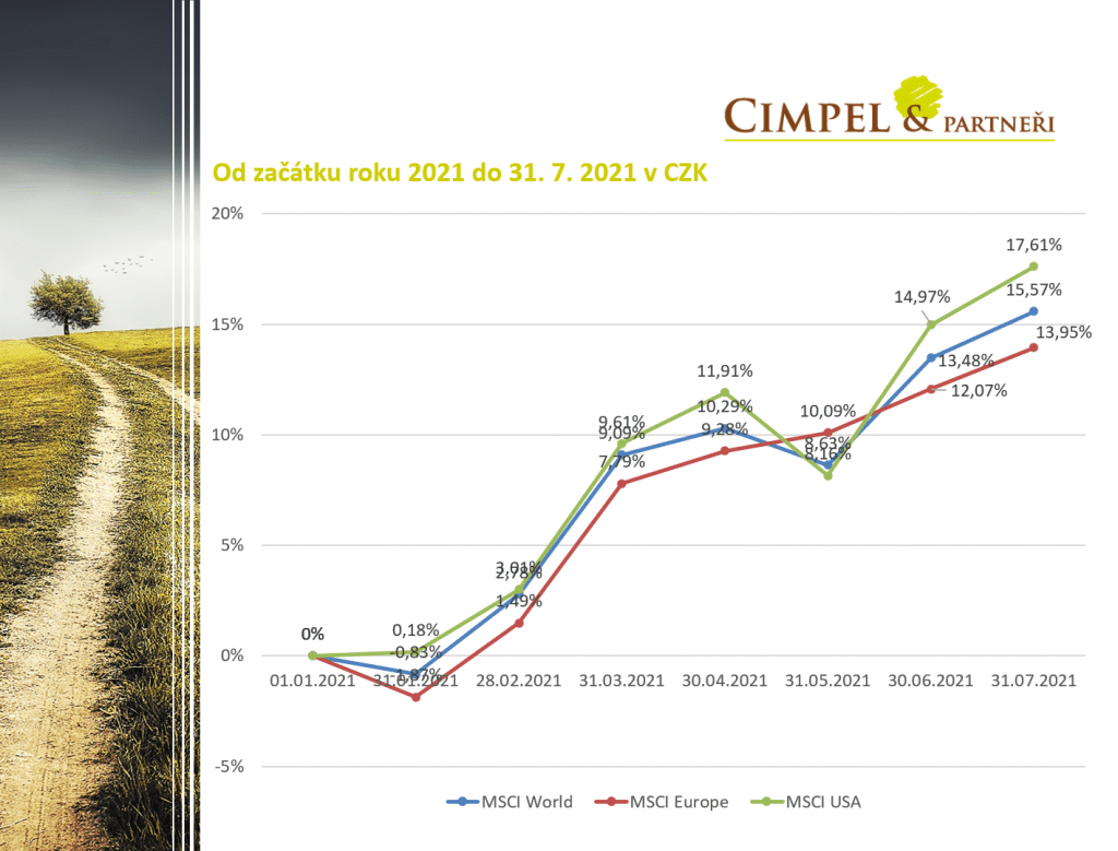 Dan: Začněme pohledem na krátké období, tzn. od začátku letošního roku do 31. července, kdy můžeme vidět, že to bylo poměrně pozitivní období. I přes veškeré komplikace, které máme spojené s covidem, bylo pozitivní v tom smyslu, že vidíme růst na americkém indexu necelých 18 %, na globálním indexu necelých 16 % a také evropské akcie nezůstávají daleko pozadu se svými 14 %. Takže vzhledem k okolnostem, které tady máme, se celkem naplňuje optimistický výhled, který jsme avizovali začátkem roku. Dáno je to velkým množstvím peněz v ekonomice i povolebním obdobím prezidenta v Americe, o kterém jsme mluvili právě začátkem roku.