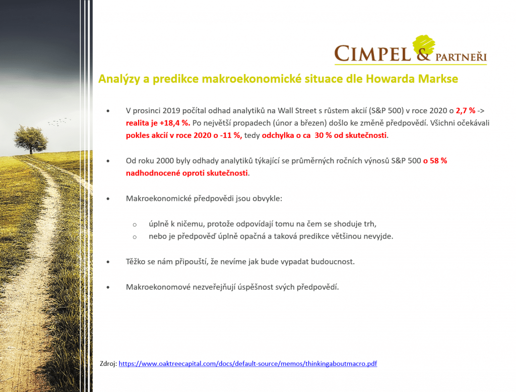To je memorandum od Howarda Markse, známého ekonoma, který popsal, proč makroekonomické předpovědi nejsou úplně vhodným nástrojem k časování trhu a proč vlastně nečasovat trh. Většina těch předpovědí je totiž mylných a ukazují to i čísla, která můžete vidět na obrázku výše.