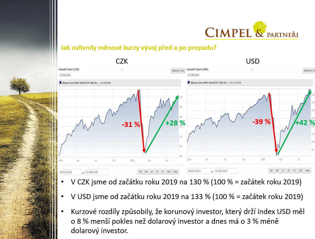 Dan: Konkrétně jsme viděli kurz 26,- Kč za dolar a dnes ho máme pod 22,- Kč za dolar. A tento pohyb způsobil korunovým investorům v případě toho propadu útlum – tzn. pomohl nám o 8 % oproti tomu, kdybychom investovali v dolarech a dívali jsme se na celou investici dolarově. Na druhou stranu, jak nám pomohl o těch 8 %, tak v období růstu nám ten růst zase utlumil a v porovnání s dolarovým investorem jsme na tom o 3 % hůř než on. Takže ve finále, když se na to podíváme v dlouhém časovém horizontu, jedná se o hru s nulovým součtem.
