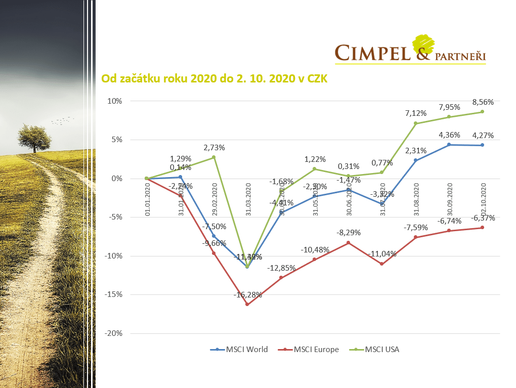 Poslední dva měsíce se v aktualitách bavíme o tom, že finanční trhy dorovnaly ve většině případů ty ztráty, které byly od začátku roku, respektive se bavíme o akciových investicích. Můžeme vidět, že světové akcie jsou od začátku roku už +4,27, americké dokonce +8,56. Bohužel, těm evropským se tolik nedaří a pořád za tím trhem zaostávají a ta hodnota zůstává zatím v záporu. U těch evropských akcií se nejedná až tak o problém čistě koronavirový. To jejich zaostávání je problém dlouhodobější a uvidíme, jestli v dalších letech se třeba role těch regionů neotočí a jestli neuvidíme, že třeba podhodnocené evropské akcie nedoženou Ameriku. Těžko říci, my to nevíme a proto se nesnažíme věštit z křišťálové koule a odhadovat, co se bude dít dál, ale raději v portfoliích využíváme ty globální akciové indexy, tzn. většinou ten index MSCI World, což je vlastně ta modrá čára, která ukazuje, že od začátku roku jsou +4,27 %