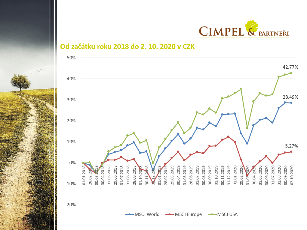 Když se podíváme na ty akciové trhy v delším časovém období a podíváme se, jak se daří akciím za poslední téměř 2 roky (tzn. od začátku roku 2018), můžeme vidět, že všechny akciové indexy – Amerika, Evropa i ten mix – ten globální index – jsou v plusu. Amerika dokonce přes 40 %, Evropa trochu zaostává, ale pořád je to +5 %, už to není mínus.