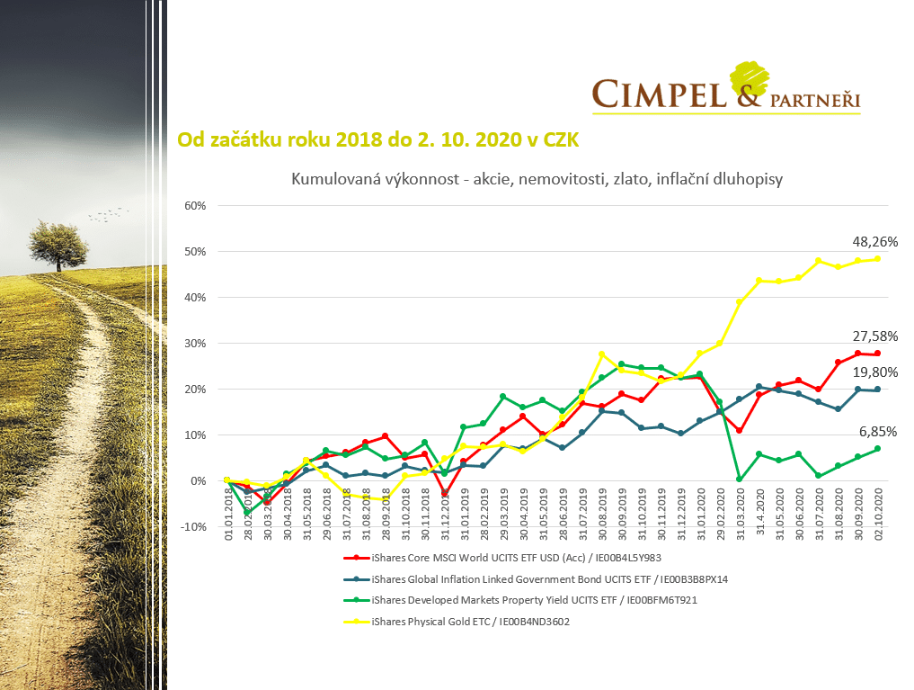 Jinak zde můžeme vidět, že + 20 % dělaly i globální inflační dluhopisy a takovým výhercem koronaviru je zlato, které narostlo za ty poslední 2 roky o 50 %. Nějaká menší část zlata v portfoliu zase může být vhodnou pojistkou pro podobné situace, kdy vidíme, že v okamžiku karantény a té největší paniky aktiva klesaly a proti tomu zlato výrazně skokově navýšilo a těch dluhopisů se to zásadně nedotklo.