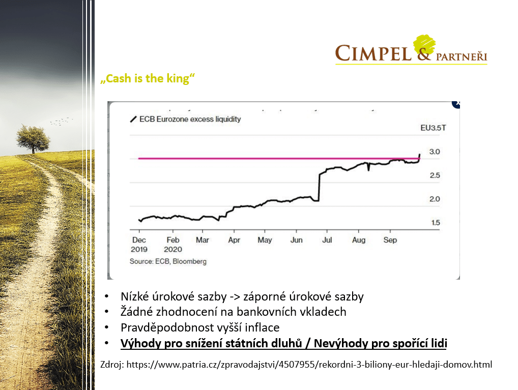 A nakonec pár zajímavostí. Tady je statistika, která nám ukazuje, jak roste kešový zůstatek na účtech Evropské centrální banky, který si u ní ukládají další banky a můžeme vidět, že ten zůstatek jenom za posledních 6 měsíců o bilion EUR vyskočil, což je obrovské číslo a je to dané tím, že Evropská centrální banka půjčuje bankám za záporný úrok. Takže dnes Vám centrální banka platí 1 % ročně za to, že jste si od ní půjčili peníze a důvodem je vlastně snaha stimulovat ekonomiku, dostat peníze mezi lidi, takže část těch peněz banky půjčují a část drží pořád na účtech ECB na nějakých minimálních úrocích. Z toho můžeme usuzovat, že s množstvím hotovosti v oběhu budou sílit inflační tlaky, takže pracujme se scénářem, že inflace do budoucna bude – ona tady dneska už je ( v Čechách máme už inflaci kolem 3 %) – a že to riziko je nezanedbatelné a měli bychom s tím jako investoři počítat a ty investice tomu přizpůsobovat. Takže hotovost do budoucna asi nebude nejsilnějším nástrojem, který bych chtěl dlouhodobě držet.