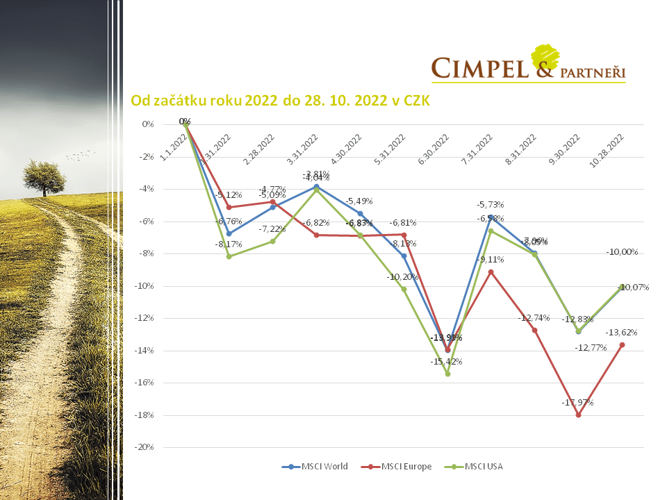 Prvním obrázkem, jak jste zvyklí, je to, jak se chovaly akcie od začátku letošního roku. Můžeme vidět, že začátek aktuálního kvartálu vypadá pozitivně. Uvidíme, jestli to neskončí jako v létě, kdy jsme po letním pozitivním nadšení viděli podzimní zchlazení, ale to nám ukáží až další týdny. Každopádně akcie americké a globální jsou aktuálně na úrovni kolem − 10 % v korunovém vyjádření. Tomu letos významně pomohl právě dolar a jeho posílení, které nám část ztrát na akciových trzích kompenzovalo.