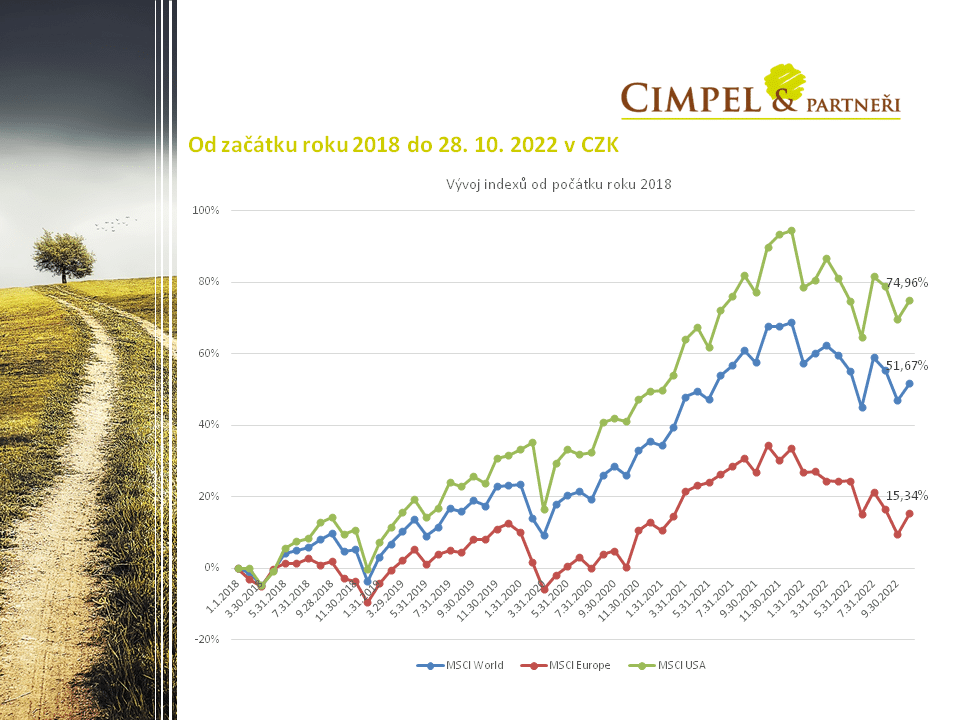 Dan: Druhý obrázek jako obvykle ukazuje delší pohled, který by nás měl hlavně zajímat. Dává nám takový ten střídmý pohled na poklesy, které dnes intenzivně prožíváme, ale s odstupem času už je dál tak intenzivně prožívat nebudeme. Ukazuje, že od roku 2018 je akciový světový index na 51,6 %, americký na necelých 75 %, jen Evropa teď bohužel na základě poklesů zaostává na 15,34 %.