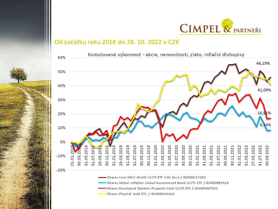 Co se dělo napříč jednotlivými aktivy. Můžeme vidět, že akcie měly tendenci posilovat. Ani další třídy aktiv, jako jsou dluhopisy nebo nemovitostní akcie, neměly tendenci dál klesat, ale stagnovaly nebo mírně rostly. Co se nám otočilo směrem dolů, je cena zlata. I na zlato negativně dopadá růst úrokových sazeb, které vytváří prostředí pro uložení peněz i různými jinými cestami, než tomu bylo u zlata. Dnes můžeme právě díky vyšším sazbám ukládat peníze na termínovaných vkladech a spořicích účtech. Nebo se nám vrací zpět na trh i různé fondy peněžního trhu nebo repofondy. To platí nejenom v Česku, ale začíná to právě platit i v Americe nebo v Evropě, kde začala Evropská centrální banka navyšovat úrokové sazby, protože ani jí už nic jiného nezbylo.