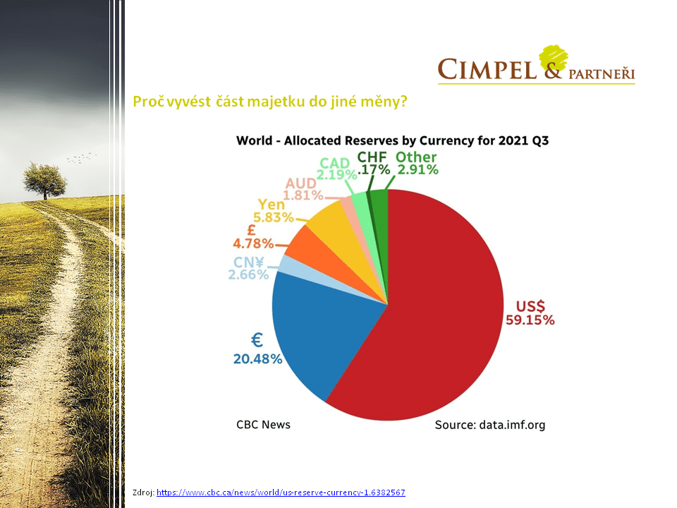 Myslím si, že aby nastal nějaký obrovský převrat, nebude to lusknutím prstu. Co ukazuje tento obrázek, je množství státních rezerv globálně a měny, ve kterých jsou tyto státní rezervy drženy. Co tam vidím, je 59 % držených v dolaru, před rokem to bylo víc jak 60 %. Pořád se bavíme o úrovni 60 % celosvětových rezerv držených v dolaru. To je obrovská dominance. Pokud se podívám na tržní kapitalizaci Ameriky, to znamená firmy, které působí ve světě, tak to je určitě také přes 50 %. Abyste mohli obchodovat jednak akcie a jednak i s těmito společnostmi, potřebujete dolar a na tom se jen tak snadno něco nezmění. Proto i uklidňuji lidi, kteří mají nějaké téma třeba dedolarizace nebo nějakého podobného oslabení dolaru, že si úplně nemyslím, že je to téma, které uvidíme a stane se hned. A když už to bude nastávat, bude to nějaká postupná výměna.