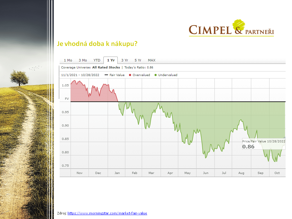 Jiří: Já se chci zaměřit na otázku toho, jestli je trh aktuálně v hodnotách, kdy už je zajímavé nakupovat. Myslím, že o tom krásně mluví tento obrázek od Morningstar, který vyhodnocuje takzvanou fair-value nebo-li férovou hodnotu akcií nebo akciového trhu jako takového. Na něm můžeme vidět, že jsme aktuálně o přibližně 14 % pod touto férovou hodnotou a je vidět pomaličku nějaký návrat nebo alespoň teď v posledním období je tam posun směrem nahoru.  14 %  je velmi zajímavá sleva pro nákupy. Jestli se sleva ještě zvětší nebo nezvětší, to těžko říci. Na druhou stranu lepší 14 % mínus, než aby to pak bylo 14 % plus, když budete na trh vstupovat. Myslím si, že obecně platí, že letošní rok je obrovskou nákupní příležitostí, kterou by neměl žádný dlouhodobý investor prošvihnout.