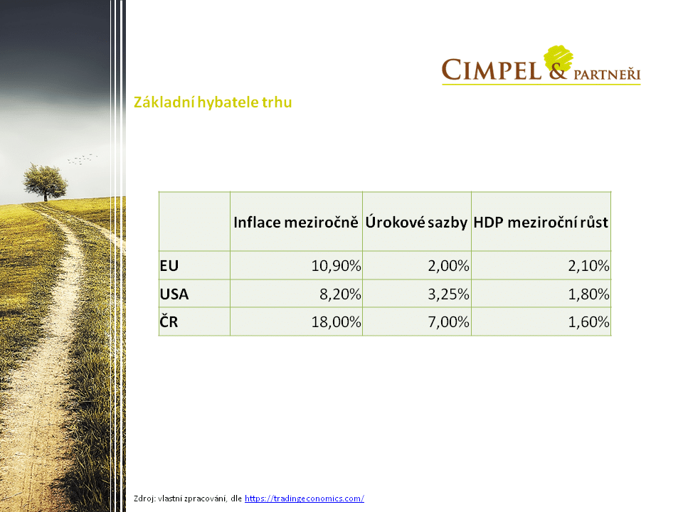Co můžeme vidět, je necelých 11 % inflace v Evropě, 8,2 % v Americe, což už vykázalo lehký pokles oproti předchozí hodnotě. Česká inflace ze 17,2 % narostla na 18 %, tedy pořád není důvod k tomu, aby sazby šly dolů. Naopak pořád můžeme mít vyhlídku toho, že sazby půjdou nahoru. Co je velké očekávání a co třeba může způsobit nějaký pokles na trhu, pokud by měl přijít, může být oznámení americké centrální banky, že navýší nad pásmo 5 %. Dnes cílí na úroveň řekněme 4,75 % až 5 %, s tím trh počítá, to už můžeme vidět, že tam není žádná negativní reakce, ale naopak trhy trochu rostly.  Pokud by ale oznámili řekněme nějaké navýšení na úrovni třeba 6 %, to může být podnět pro to, aby se trhy propadly dál. Musíme si říci, že to může nastat a není to žádná tragédie. Naopak z pohledu dlouhodobého je to prodloužení času, kdy můžeme nastupovat do trhů s výraznou slevou.