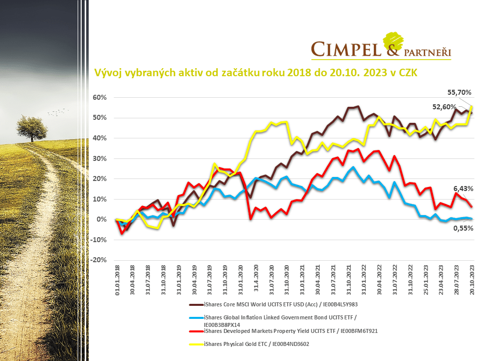 Jiří: Zároveň tento obrázek ukazuje, že akcie jsou, jak jsme už říkali, poblíž svých maxim, ale vidíme, že dluhopisy a nemovitosti jsou pořád na pomyslném dně od své maximální hodnoty začátkem roku 2022. Je tam tedy velký potenciál do dalšího období, že budou tyhle poklesy v nějaké míře kompenzovat. Řekl bych, že v principu tato aktiva čekají na otočení úrokových sazeb a na to, kdy začne trend nějakého uvolňování, které zase s jistotou dříve nebo později přijde. Opět samozřejmě nevíme, kdy ten okamžik nastane. Zatím odhad mluví o příštím roce, ale nespekulujme teď, jestli to bude na začátku, v půlce nebo na konci.