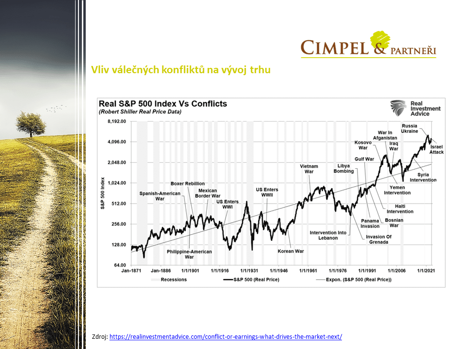 My jsme zmiňovali, že samozřejmě finanční trhy nějakým způsobem ovlivnil konflikt na Blízkém východě. Nechci teď hodnotit jakýkoliv společenský nebo humanitární dopad téhle krize, ale čistě jen investiční dopad na finanční trhy. Na této časové ose můžeme vidět zpět do extrémně dlouhé historie, že finanční trhy si s konflikty a speciálně s regionálními konflikty poradily vždy velmi rychle. Viděli jsme většinou nějakou rychlou krátkou reakci a návrat trhů do původních pozic. Izraelsko-palestinský konflikt zatím vlastně žádnou velkou reakci na finančních trzích nezpůsobil a pokud se nepřelije do nějakého problému, který by mohl způsobit například problémy se zásobováním ropou, vlastně ani žádný zásadnější dopad na trhy mít v tuto chvíli pravděpodobně nebude.