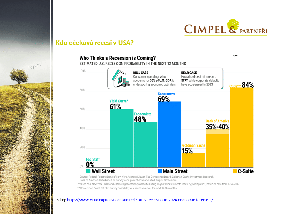 Dan: Poslední, co máme připraveno, je odhad vnímání možného vzniku recese v Americe. Je to odhad různých ukazatelů a různých skupin lidí, kteří tipují nebo na základě dotazníkového šetření odpovídají, zda si myslí, že nastane v následujících 12 měsících recese v Americe. Krásně vidíme, že je tam Yield Curve, výnosová křivka, která má inverzní tvar, obrácený, než standardně má mít, a tomu je přisuzováno přes 60 %, že nějaká recese nastane. Ekonomové odhadují na 48 %. Spotřebitelé, běžní lidé, co chodí do obchodu, co spotřebovávají produkty a služby, vnímají, že vznikne s nějakou 70% pravděpodobností. A s největší pravděpodobností 84 % je vnímaný CEOs, to jsou vedoucí lidé ve firmách, kteří pravděpodobně mají dobrý výhled na to, jak se firmám daří, na co se připravují. Uvidíme, co nám přinese.