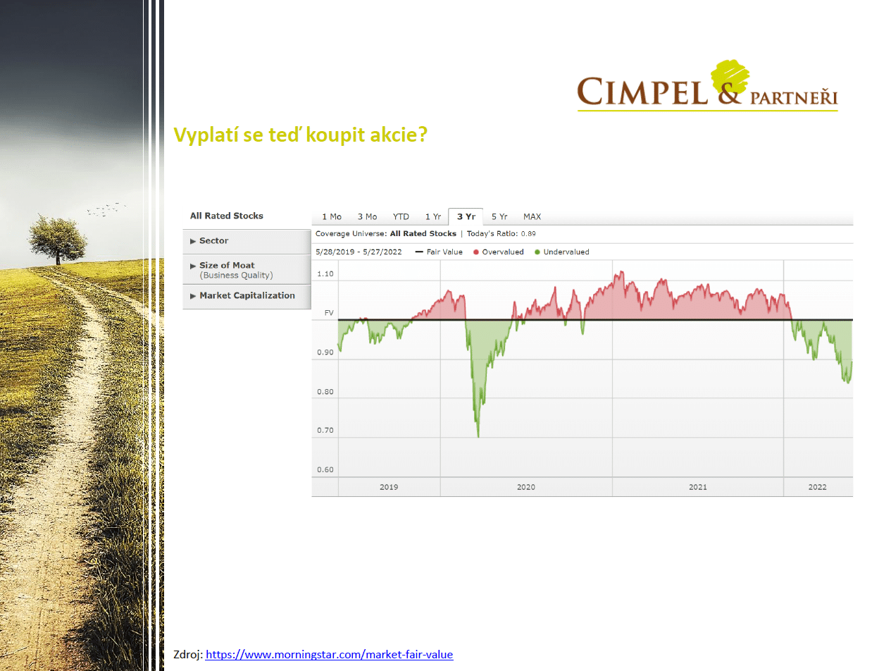 Dan: Další obrázek, který může potvrzovat tuto myšlenku, ukazuje, jak jsou akcie oceněné. Vycházíme z hodnocení od Morningstar, oni tomu říkají fair value, to znamená férová cena za akcii, kterou oni na základě výpočtu stanoví. To je ta černá čára uprostřed grafu, ta ukazuje nějaký férový stav. Cokoliv je nad (červeně), je nadhodnoceno, akcie jsou takzvaně přehřáté. Cokoliv je pod (zeleně), je podhodnocené a akcie kupujete s nějakou slevou.  Jak vidíme, Morningstar a jejich analýza, která je poměrně rozsáhlá, ukazují, že dnes kupujeme s poměrně hezkou slevou – v tom zeleném.