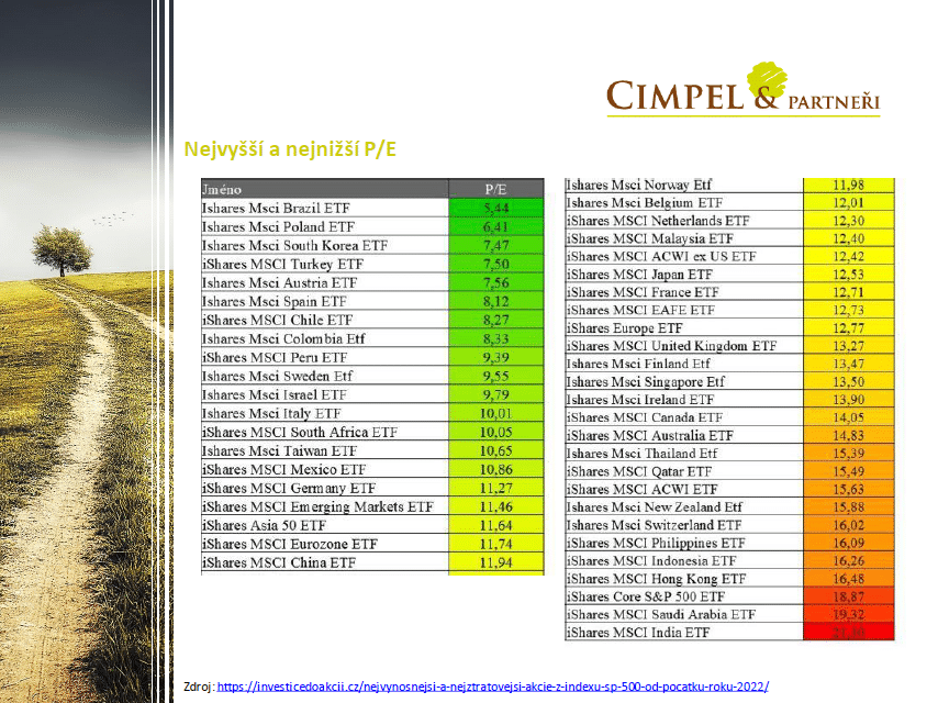 Tady je pohled na základní ukazatel, který se v investicích používá, je to ukazatel P/E, kde P je cena a E je zisk. Ukazuje, když to zjednodušíme, za kolik let se vrátí současná investice do akcie v přepočtu na zisk dané společnosti. Kolik let bude trvat, než společnost vydělá na to, aby vám splatila cenu, kterou jste na začátku za akcii zaplatili. Říká se, že když je P/E pod 15, jsou akcie podhodnocené a nákup je atraktivní. To je hodnota, kterou jsme mnoho let neviděli na většině trhů.