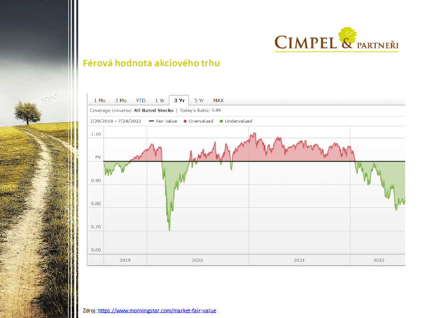 Dan: S tím souvisí poslední graf od Morning Star, který ukazuje, jestli jsou akcie podhodnocené nebo nadhodnocené, tak jak jsme viděli ukazatel P/E. I tady se nám potvrzuje i z jiného zdroje, že prostředek – fair value (férová hodnota) – je dnes v zelené části, která nám říká, že jsme podhodnocení. Zelená barva proto, že je to dobře, že můžeme nakoupit se slevou. Kdo má nějakou možnost, teď může být ta vhodná chvíle, kdy vstoupit na trh a pořídit akcie nebo vaše portfolio za rozumné ceny.