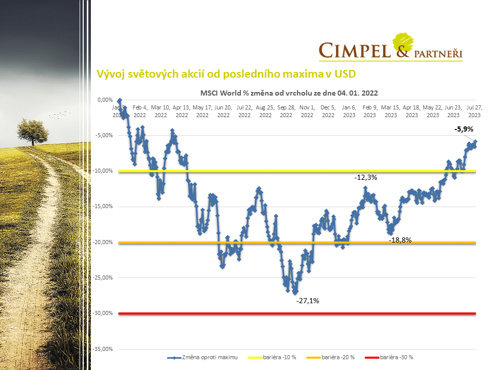 Jiří: Když se podíváme na trhy v trochu delším časovém horizontu, můžeme vidět, že se akcie skutečně pomalu blíží na úrovně svých maxim. Zde vidíme indexy v korunovém vyjádření po započtení měnových kurzů a vidíme, že na globálních akciích (modrá čára) jsme skutečně velmi blízko hranice maxima na začátku loňského roku. Snad se nám blýská na lepší časy. Nyní samozřejmě čekáme, jak bude ekonomika reagovat na vysoké úrokové sazby. To ještě může být něco, co zamíchá kartami. Každopádně ty největší poklesy související s korekcí loňského roku mají trhy v tuhle chvíli zřejmě za sebou.