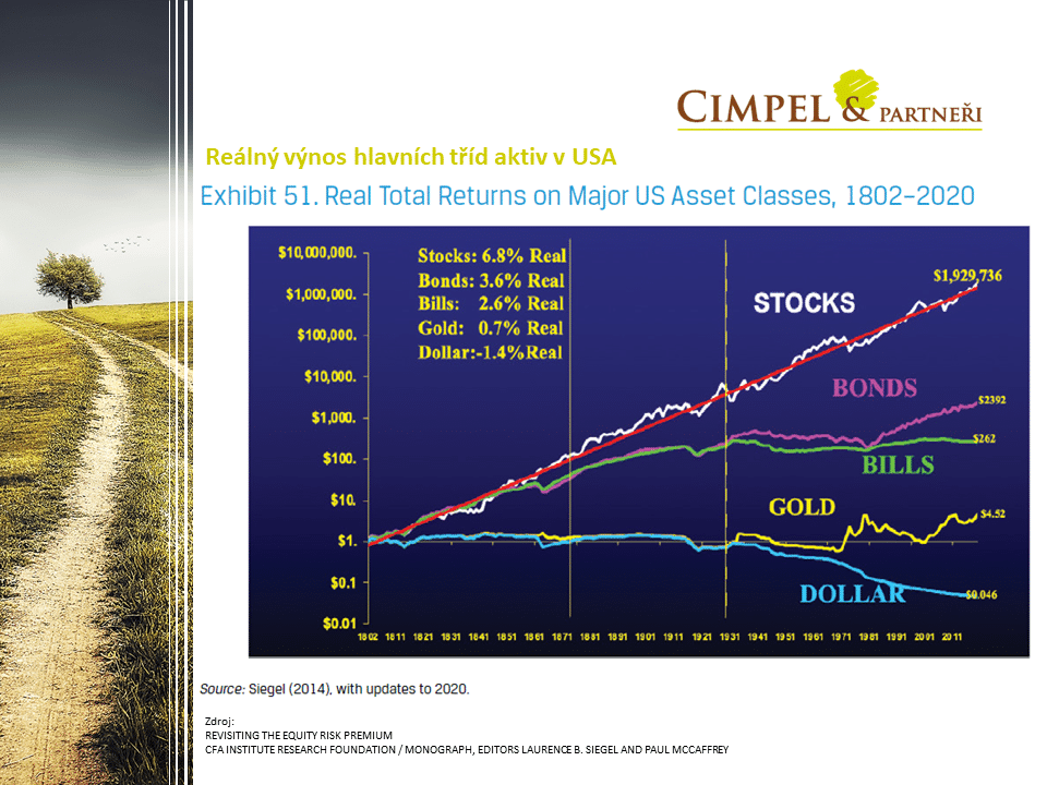 Dan: Na závěr jsme si připravili zajímavý vývoj od roku 1802 do roku 2020, který zpracoval institut CFA. Krásně ukazuje reálné výnosy jednotlivých aktiv v Americe. Reálný výnos znamená očištěný o inflaci, snížený o inflaci, která historicky byla. Můžeme krásně vidět jednotlivé křivky, kde dominují americké akcie (bílá křivka), pod nimi jsou konzervativnější dluhopisy (fialová křivka), pokladniční poukázky nebo krátkodobé dluhopisy (zelená křivka) a níž už je zlato a potom dolar, což je vlastně hodnota 1 $ v tom čase. Tam můžeme krásně vidět, jak se inflace podepisuje na hodnotě 1 $. Je vidět, kdo je tahounem, kdo umí dlouhodobě bojovat s inflací a proč zastávají ve většině portfolií dominantní postavení akcie. Jsou to aktiva, která jsou produktivní, zvládají vytvářet novou hodnotu, nějakou přidanou hodnotu, vytvářet zisky, chtějí zvyšovat tržby a tak podobně. To je hnací motor, který potřebujeme mít, abychom si dlouhodobě zvládli poradit s inflací.