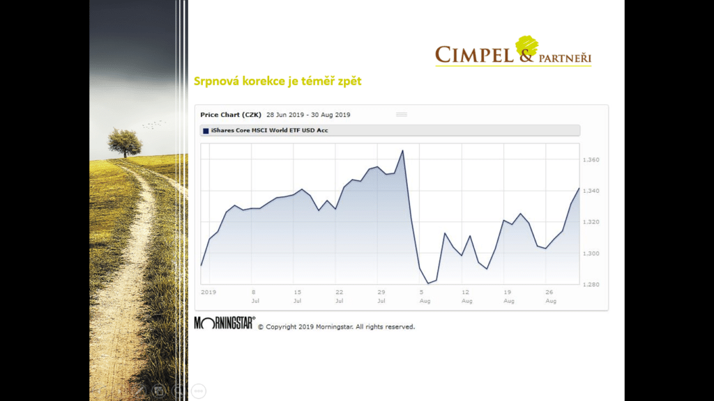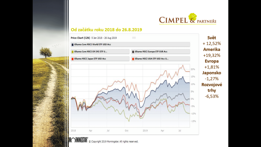 Dan: Je to vývoj od začátku letošního roku a tam je vidět, že i přes takové korekce, jako byla tato v srpnu, je celý svět na úrovni +17 %, obdobně je na tom Amerika +20 % a i ostatní regiony jako Evropa, Japonsko, ale i ty rozvojové trhy jsou vlastně plusové. Takže volatilitu tu máme a ještě jí určitě uvidíme, ale ty trhy se tváří zatím hezky a běží dál.