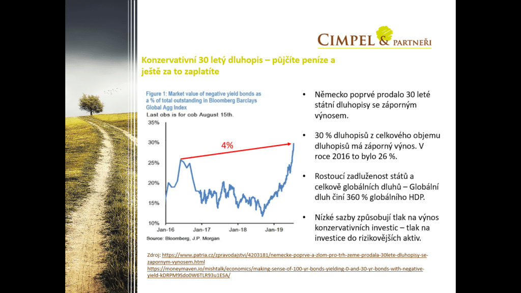 Dan: Když se podíváme na nějaké zajímavosti, mě třeba zaujal článek na Patrii, že Německo poprvé vydalo 30letý státní dluhopis, takže konzervativní investici, se záporným výnosem. Prakticky to znamená, že Vy Německu půjčíte peníze a za to jim ještě platíte 0,3 %. Což asi není úplně to, co bychom chtěli. Německo není jedinou zemí, která to takto má. Když se podíváme na nějaký agregovaný index, uvidíme, že 30 % dluhopisů z celkového objemu je se záporným výnosem. Takže, dejme si na to pozor, není to standardní období a měli bychom tudíž i nestandardně reagovat a přizpůsobovat své investice budoucnosti a tomu, co nám ten finanční trh přináší.