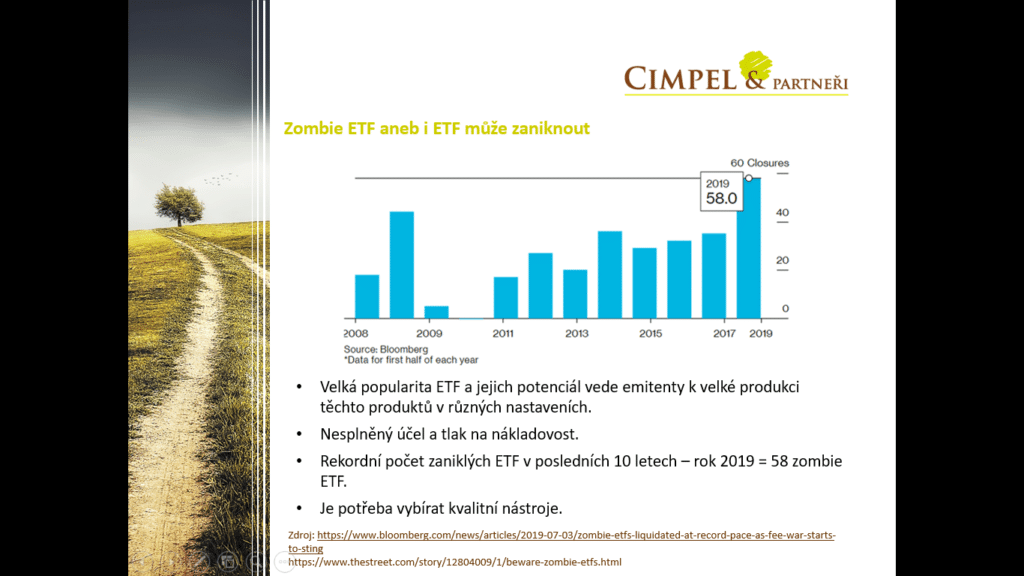 Jiří: Já jsem si vybral článek z Bloombergu o tzv. Zombie ETF fondech. Jsou to fondy, které nesplnily očekávání tvůrců a zanikly předčasně. Bylo to letos 60 fondů a jenom na tom příkladu chci uvést, že i na ETF fondy doléhá tlak na snižování nákladů, který zažívají investoři na celém světě. Je to nejčastější důvod odlivu peněz z aktivních fondů do těch pasivních. Ale i ty pasivní fondy s tím zápasí. To, že skončí ETF fond neznamená, že by tam investoři přišli o peníze, znamená to to, že ten Broker prodá veškerá aktiva a vyplatí zpátky investorům peníze, ale ani to není v každém okamžiku výhodné, ať už ohledně daní nebo k situaci na trhu. Takže dejte si pozor na to, co kupujete a i u ETF fondů vybírejte pečlivě.