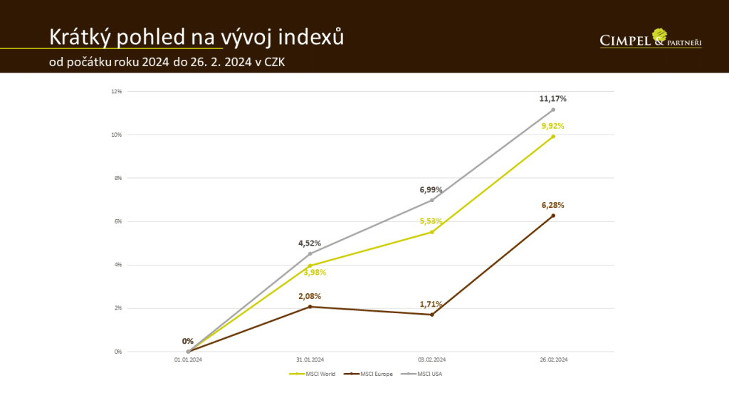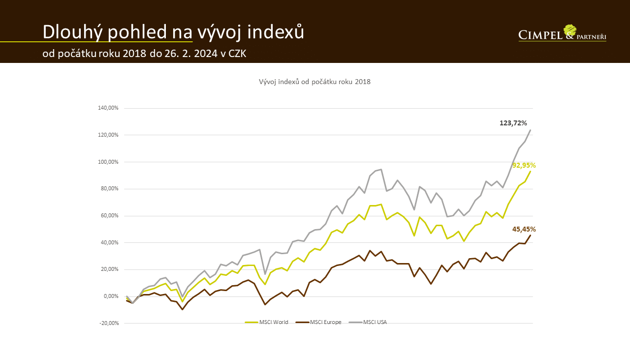 Dan: Delší horizont ukazuje docela hezký vývoj, stejně jako vidíme na krátkém horizontu od začátku roku. Pokračujícím trendem z roku 2023 je poměrně strmý růst přes 123 % na amerických akciích v přepočtu do Kč. Ten kurz nám také trochu pomáhá, protože jak se snižují úrokové sazby v České republice, oslabuje to korunu a oproti tomu posiluje dolar, což investorům, kteří investují v cizí měně, pomáhá směrem nahoru. Na světovém indexu jsme lehce za americkým indexem na necelých 93 %. Přestože i Evropa vykazuje od začátku roku růst, vidíme, že ta zaostává nejvíc jak za světovým, tak za americkým indexem, je na 45 %. Uvidíme, jak ten rok bude pokračovat, zatím panuje na trzích optimismus, tak doufejme, že přetrvá.