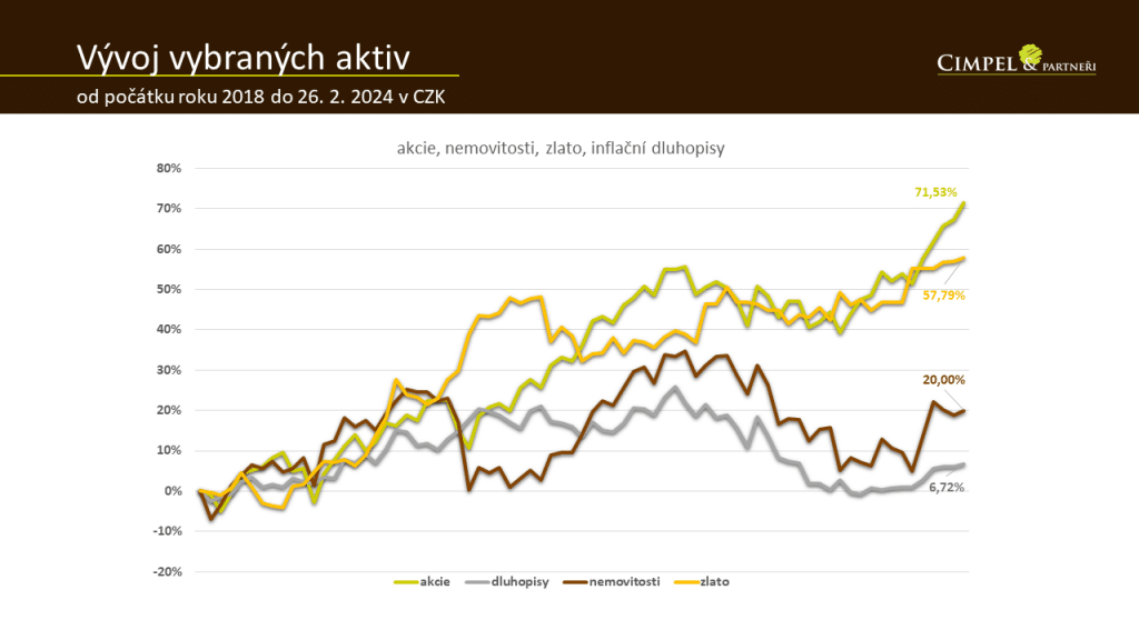 Jiří: Mně přijde ten obrázek vlastně hezký i v tom, že vidíme, že na šestiletém horizontu globální akcie vydělaly násobek toho, co jste do nich vložili v roce 2018. Přijde mi to zajímavé i tím, že to nebylo vyhlazené období, rozhodně to nebylo tak, že by trhy jenom rostly. Měli jsme tady poklesy na měnách, měli jsme tady covidovou pandemii, což je klasická labuť, která na trhy nečekaně přiletěla. Měli jsme tady i dvanáctiměsíční pokles na trzích, extrémně vysokou inflaci a velkou míru růstu úrokových sazeb. Přes to všechno je výsledek na úrovni násobku. A tohle si myslím, že je dobrý příklad toho, proč třeba my ta naše portfolia stavíme na burzovně obchodovaných cenných papírech a z velké části na akciích. Prostě proto, že je to jedno z aktiv, které si v tom dlouhém horizontu skutečně dokáže s inflací poradit.