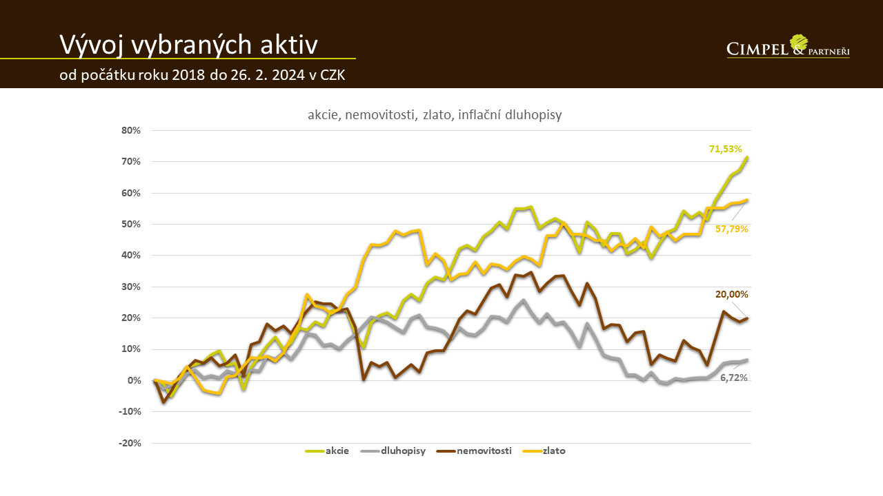 Tady můžeme vidět, jak se dařilo různým třídám aktiv. Šedivé a hnědé čáry jsou dluhopisy a nemovitostní akcie, které pořád vlivem vysokých úrokových sazeb zůstávají dole a čekají na svou příležitost. Vzhledem k tomu, že inflace například v České republice se dostala pod 3 %, jsme na úrovni kolem 2,3 %, což ještě před rokem bylo nepředstavitelné, americká inflace je na úrovni kousek přes 3 %, můžeme říci, že šance, že i americká centrální banka začne s úrokovými sazbami hýbat směrem dolů v letošním roce, je vysoká. Odhad trhů je na druhou polovinu letošního roku, kdy už by sazby mohly jít dolů. To bude jednoznačně pozitivní impuls a signál pro dluhopisy a akcie nemovitostních společností.
