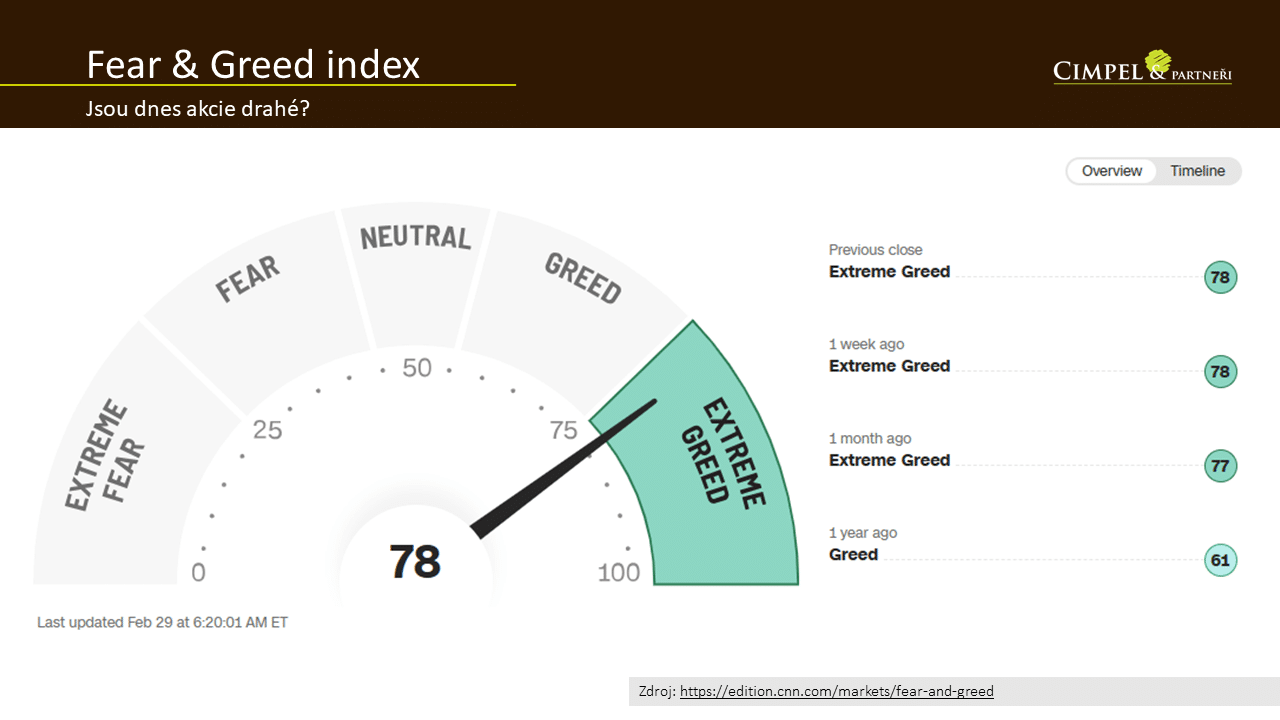 Dan: Tady je zajímavý pohled na tvou otázku z úvodu, když akcie rostou, zda už dnes nejsou moc drahé. Překonali jsme all time high v posledních měsících, je tedy přirozené se ptát, jestli je dobré teď vstupovat do akciového trhu, nebo ne? Tady ten ukazatel od CNN ukazuje, že jsme v takzvaném Extreme greed, takové té nenasytnosti toho, že to roste, tak do trhů vstupujeme, máme tendenci hodně nakupovat. Velmi často to bývá indikátor zpozornět a dát si pozor, jestli nemůže přijít nějaká korekce na trhu. Další obrázky prezentace nám ukáží zajímavý pohled, který doplní přesně tuto myšlenku, jestli je ještě vhodné investovat do akcií, nebo čekat, nebo jak s tím pracovat.