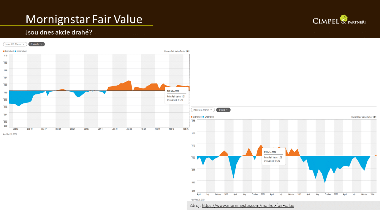 Jiří: Tady můžeme vidět, jak vypadá takzvaná fair value z pohledu Morningstaru. Fair value ukazuje, jestli jsou akcie vzhledem k nějakým vnitřním hodnotám v tuto chvíli spíš přeceněné, nebo spíš podhodnocené a je zajímavé je nakupovat. Na levém obrázku můžeme vidět současnou situaci v krátkodobém pohledu. Z tohoto pohledu jsou akcie spíš v kategorii toho, že jsou dražší, že jsou nad svou fair value. Mohli bychom si říct, fajn, teď kupujeme za trochu vyšší cenu, než by třeba bylo úplně optimální z pohledu férovosti a z pohledu vnitřní hodnoty. Ale když si poodstoupíme a podíváme se na obrázek v delším časovém horizontu, můžeme vidět, že reálná hodnota toho přecenění, té drahosti akcií bývá většinou podstatně vyšší. My se teď díváme na to, že jsou v podstatě na úrovni férové hodnoty, protože ten pohyb, ten zobáček směrem nad férovou hodnotu, je skutečně velmi zanedbatelný. Dlouhodobý pohled je v tomto směru zásadní. Z našeho pohledu nejsou akcie na nějaké úrovni bubliny, nejsou přefouknuté, vstup do nich je určitě smysluplný a jejich cena odráží ziskovost firem a potenciál dalšího růstu.
