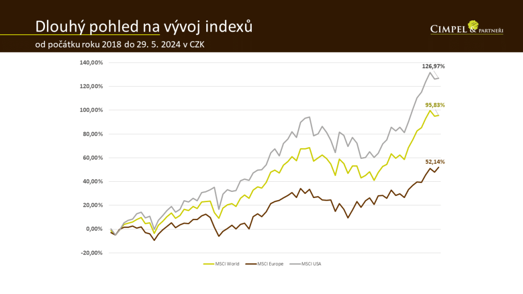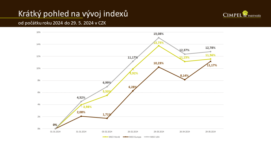 Pojďme se podívat, jak se trhům daří od začátku letošního roku. Vidíme, že celkem pozitivně, na Americe jsme necelých 13 % plus, obdobně je na tom i světový akciový index a dohánět je začíná i Evropa. Evropa to dohání zejména kvůli tomu, že Amerika zhoršila výhled na snižování úrokových sazeb, takže Evropa měla trochu šanci to v letošním roce dohnat. Zároveň ale můžeme vidět, že se růst od posledních maxim na amerických i světových indexech trochu zastavil a zatím se očekává, jak se to bude vyvíjet dál.