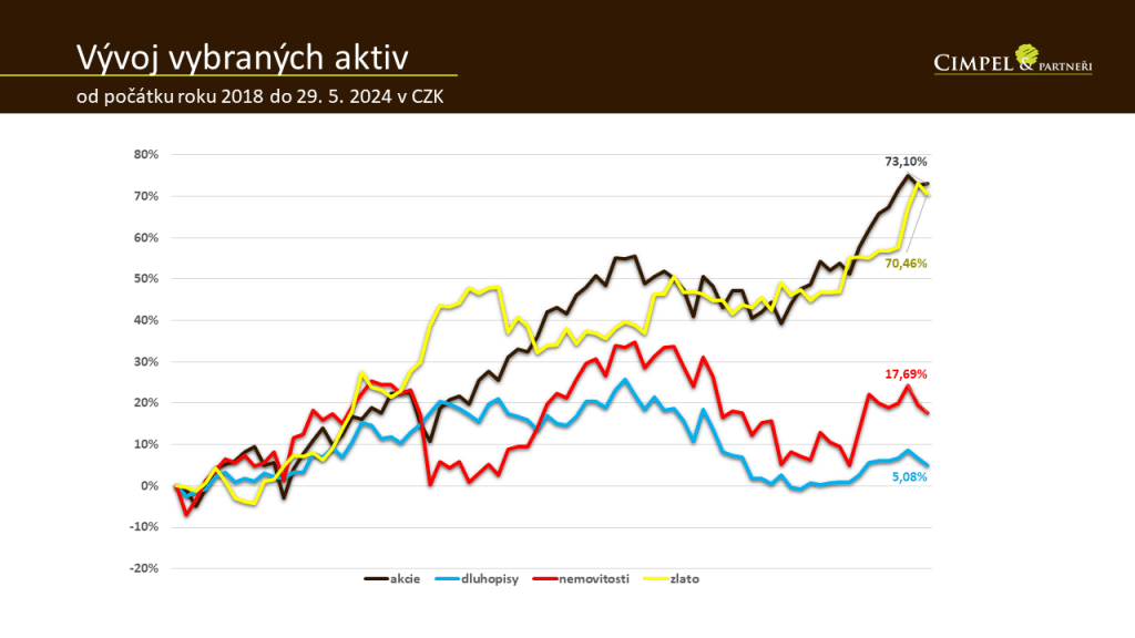 Dan: Pokud se podíváme i na ostatní typy aktiv, jako jsou zlato, nemovitosti a dluhopisy, udělalo v porovnání s akciemi asi nejzajímavější pohyb během letošního roku zlato. Není to vlastně nic překvapivého, když si uvědomíme, v jakém období se nacházíme. Bavíme se o období vysoké kolísavosti, máme tady stále geopolitické napětí, volební období v Americe a nejenom tam… Zároveň pořád přetrvává nejistota ohledně inflačního vývoje, a to všechno dohromady s očekáváním, kam se budou vyvíjet úrokové sazby, pomáhá růstu ceny zlata, respektive přelivu peněz do zlata jako bezpečného přístavu. To jsou zásadní faktory, které stály za růstem ceny zlata.