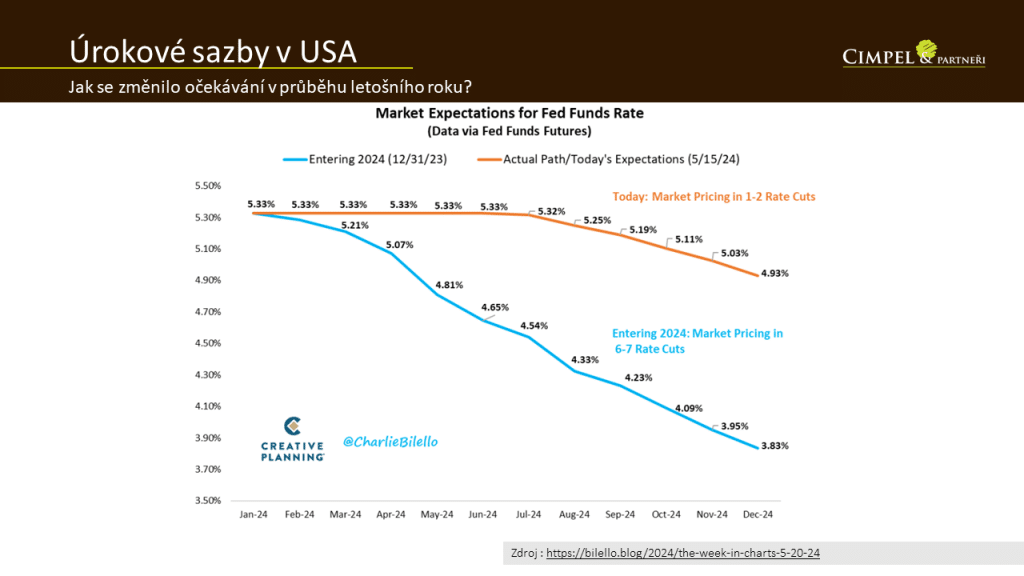 Když se podíváme na slibované predikce, tak tady první obrázek, co jsme si připravili, je výhled na snižování úrokových sazeb ze strany FEDu. Vidíte tam dvě čáry, ta modrá je výhled, který platil ke konci loňského roku, a oranžová je výhled, který platí z pohledu analytiků k současné chvíli. Můžeme vidět, že podle analytiků jsme teď měli být už pod 5 %, už jsme za sebou měli mít nějaké to snižování. Realita je taková, že FED zatím setrvává v pozici, nesnižuje a místo odhadovaných šesti až sedmi snížení úrokových sazeb v letošním roce trh nově předpokládá, že by mělo dojít k jednomu až dvěma snížením. A pozor, pořád se bavíme o předpovědi. Teprve až na konci roku si budeme moci říct, jestli se ta oranžová čára alespoň přiblížila realitě, nebo jestli třeba bude i ona daleko od reality, stejně jako byla ta modrá. Tím samozřejmě chceme ukázat, že predikce je vždycky jenom predikce a neměli byste na jejím základě dělat žádné zásadní investiční rozhodnutí.