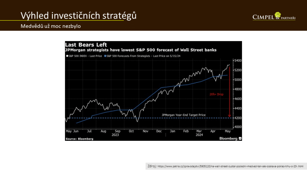 Dan: A predikcí budeme trochu i pokračovat. Na grafu, který vidíte, ukazuje bílá čára vývoj indexu S&P 500, jeho skutečné hodnoty, které proběhly od května loňského roku do května letošního roku. Zároveň protíná graf světle modrá linka, která ukazuje průsečík odhadů investičních stratégů renomovaných bank, ať už je to Goldman Sachs, JP Morgan apod. Tam vidíme, jak moc se jejich odhady přiblížily ke skutečnosti. Mnohdy to vypadá, že byly úplně jinde, a vypadá to, že byly jinde mnohem častěji, než by asi chtěli. Na druhou stranu, co si z toho můžeme vzít, je, že upravili očekávání pro letošní rok. Oni dnes neočekávají nějaký zásadní propad do konce roku, ale neočekávají už ani zásadní růst. Můžeme se na konci roku podívat, jestli se trefili, nebo ne. Zůstal tam jeden tzv. medvěd a to byl investiční stratég banky JP Morgan, který odhaduje 20% pokles do konce letošního roku. Uvidíme, co nás čeká, já sám jsem na to zvědavý. Jak vidíme, analytici se velmi často mýlí a tady nám ukazuje jedna statistika, jak moc.