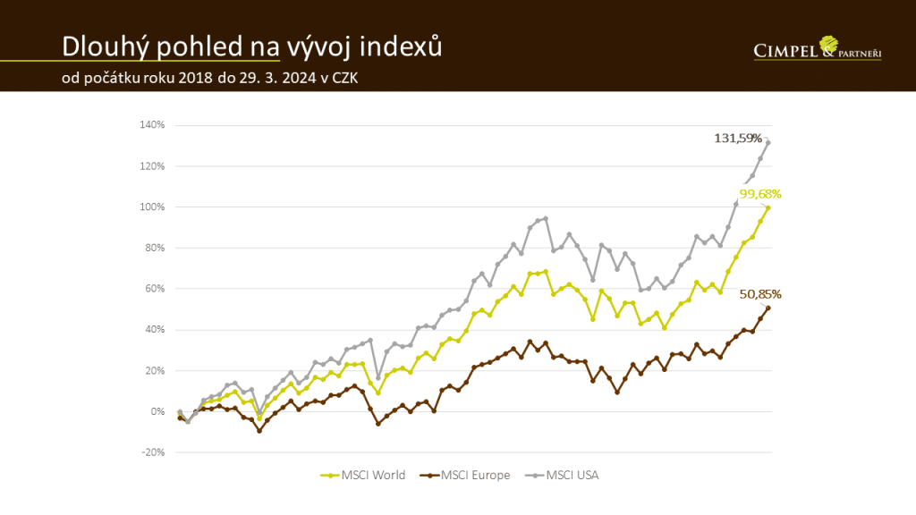 Dan: Zde můžeme krásně vidět, jak je vývoj od začátku roku pozitivní. V dlouhodobém kontextu můžeme říci, že jsme dosáhli nových vrcholů. Pozitivní je pohled třeba na americký akciový index, který je přes 130 % v plusu. To jsou všechno krásná čísla i po tom, co jsme si prošli poměrně kostrbatým obdobím. Když to vezmeme od roku 2018, jak zde můžeme vidět. Ať už to byl covid, ať už to byl rok 2022 a vysoká inflace… bylo to nelehké období a trhy se s tím zvládly poprat.