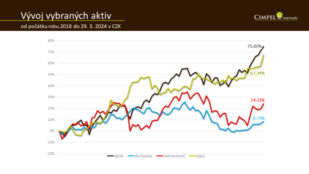 Jiří: Když se podíváme, jak se chovaly různé třídy aktiv, můžeme vidět základní aktiva – akcie na vrchu, to žluté pod nimi je zlato, pak vidíme červené nemovitosti, resp. ceny burzovně obchodovaných nemovitostních společností, a dole dluhopisy. Můžeme vidět, že od roku 2018 je na tom zlato s akciemi velmi podobně. Globální akciový index a cena zlata stojí téměř to samé. Zlato teď reaguje prudce na nějaké politické nejistoty na světovém indexu a zároveň je to možná reakce na inflaci, která ve spojených státech úplně nepolevuje, respektive zatím neklesá k cílové hodnotě 2 %. To samozřejmě vytváří mírnou nejistotu i na úrovni třeba dluhopisů, které dlouhodobě očekávají opačný pohyb úrokových sazeb, tedy, že začnou úrokové sazby klesat. V Čechách už to vidíme několik měsíců, v Americe zatím na ten pohyb vyčkáváme. Trh zatím stále očekává, že v letošním roce dojde třikrát ke snížení sazeb. Zatím se čeká, kdy s tím FED začne. To bude určitě důležitým impulsem i pro dluhopisy a ceny nemovitostí, protože samozřejmě ta červená čára nemovitostních akcií je velmi vázaná na vývoj úrokových sazeb, protože jsou ty nemovitostní společnosti z velké části financovány úvěrem, a proto do jejich zisku dramaticky promlouvá výše úrokových sazeb.
