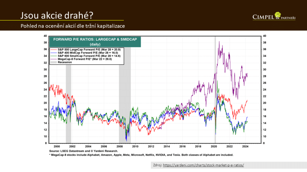 Jestli jsou akcie drahé, nebo ne? Můžeme říci, že nejsou až tak předražené, pokud se podíváme na trh jako celek a nebudeme hodnotit jen těch pár největších hráčů. Pokud se podíváme ještě na ty další, jsou to společnosti s menší tržní kapitalizací, takové ty malé a střední. Tam vidíme, že zatím vyčkávají na svou šanci, jak se to bude vyvíjet dál. Je to celkem logické, je to podobné, jako když Jirka mluvil o nemovitostech. I tyto společnosti jsou hodně vázané na úvěrování a financování z cizích zdrojů, z bankovních peněz, a to se odvíjí od úrokových sazeb. Až dojde k nějaké slevě na těchto penězích, oni si budou moct levněji půjčit, tak velmi pravděpodobně i tento ukazatel forward P/E půjde nahoru. A bude to znamenat i nějakou vyšší ziskovost na těchto akciích.