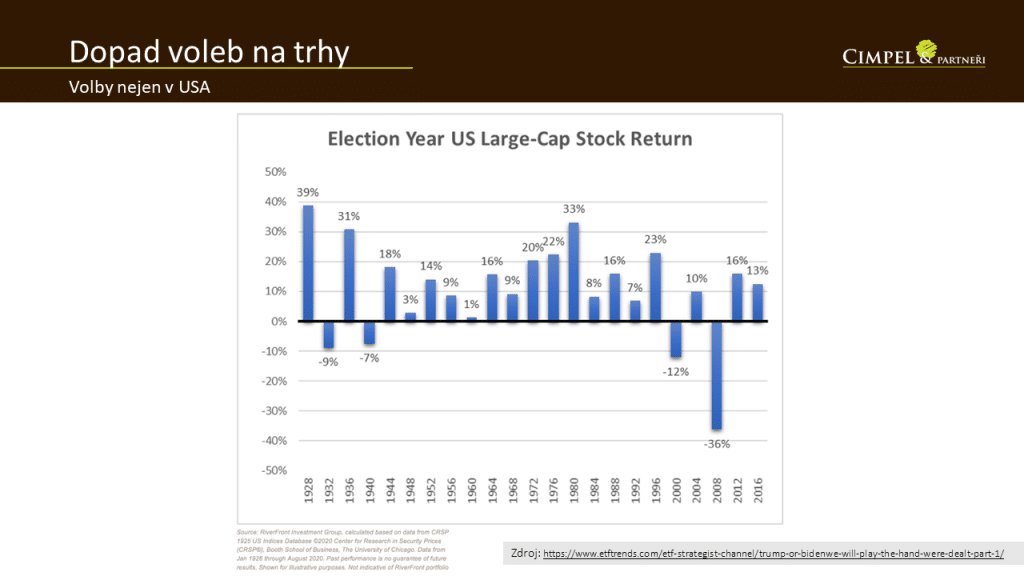 Pokud se podíváme na výhled na současný trh s ohledem právě na americké prezidentské volby, které nás na podzim letošního roku čekají, využili jsme statistiku, která ukazuje, jak dopadly velké americké akcie ve volebním roce za posledních více než 100 let. Můžete vidět, že byly vlastně jenom čtyři období, kdy ve volebním roce akcie skončily na konci roku záporně. Těmito obdobími byly roky 2008, 2000, 1940 a 1932. Což všechno byly roky, kdy vliv na konečnou hodnotu akciových indexů měla spíš ekonomická situace, většinou nějaká krize než politika jako taková. Z tohoto pohledu je volební rok většinou spíš pozitivní a čekají nás spíš pozitivní výsledky. I když je potřeba se samozřejmě připravit na velkou míru dynamiky trhu. Musíme očekávat, že akciový trh bude hodně kolísavý. S tím, jak se budou volby blížit, bude ta kolísavost, volatilita větší. Pro dlouhodobého investora to nic neznamená. Maximálně to, že je potřeba se trošku obrnit před kolísavostí, ale z pohledu dlouhodobého výsledku můžeme čekat letošní výsledek pozitivní.