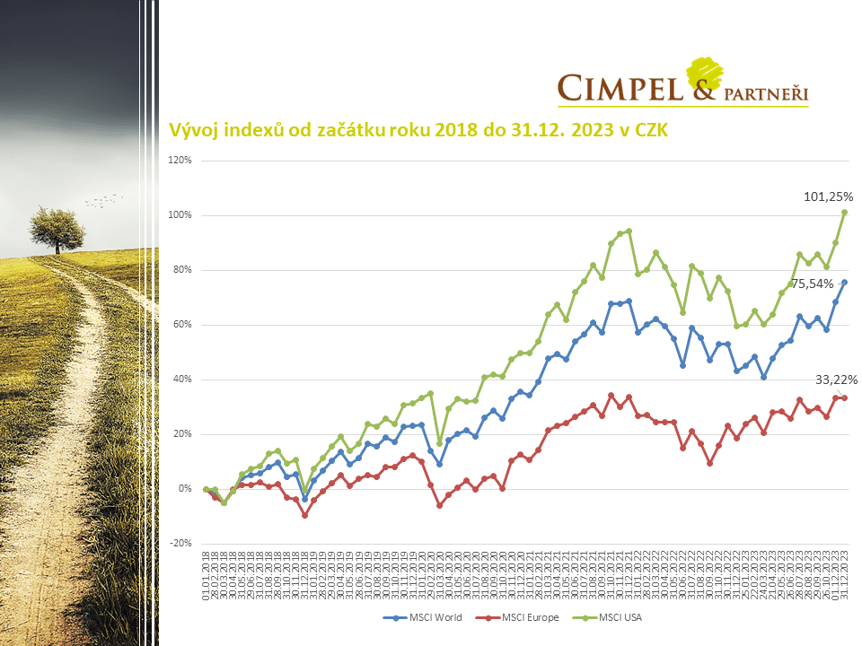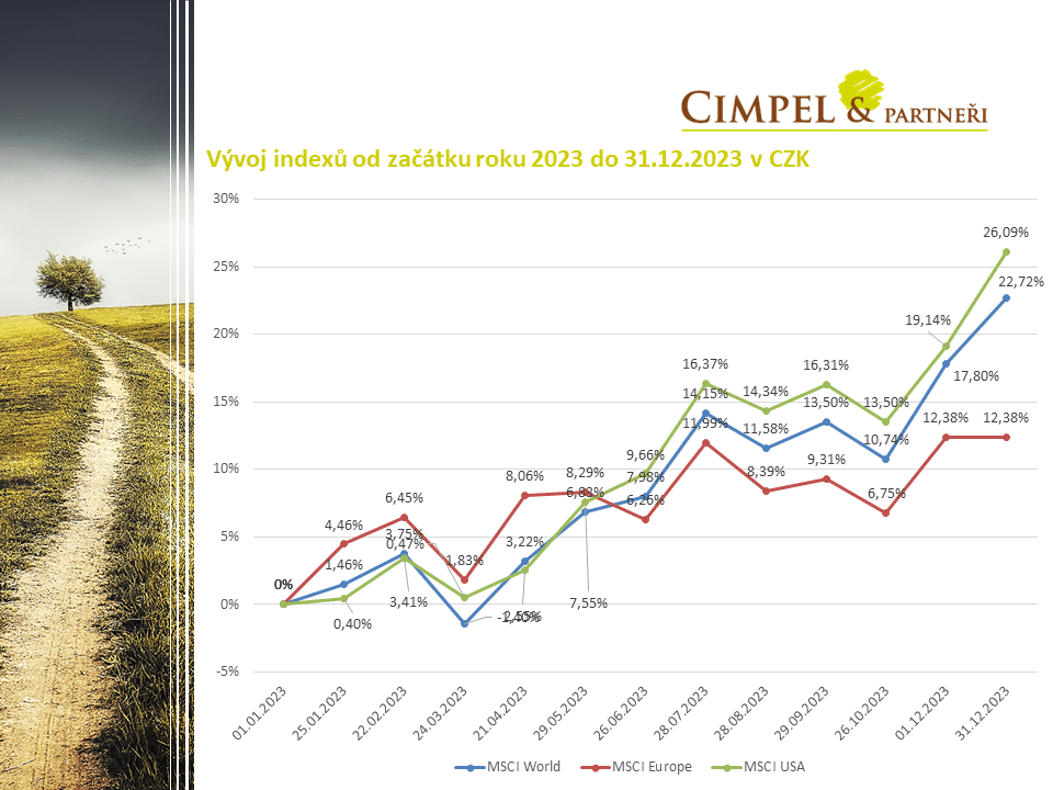 Jiří: Když se podíváme na závěr roku, byl minimálně z pohledu amerických akcií extrémně pozitivní. Americké akcie zavíraly na úrovni 26 % od začátku roku předchozího. Jak Dan za chviličku ukáže, je to pozitivní zpráva i z pohledu dlouhodobého, protože ten rok se nesl hlavně v duchu návratu cen akcií na svá původní maxima, která měly na začátku roku 2022. Evropě se ani nedařilo, ani dařilo, výsledek je podobný jako v předchozím měsíci, prosinec nijak neexceloval. Musíme opět říct, že ve druhé polovině roku se znovu rozevřely nůžky mezi vývojem na evropských a amerických trzích. Amerika nabrala dech a celkovým výnosem dramaticky předbíhá Evropu.